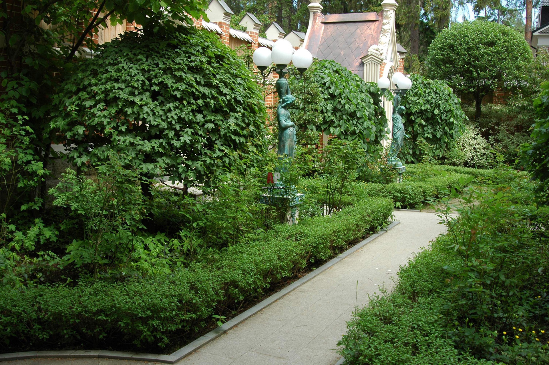 Вдоль дорожек высажены кусты роз алого и белого цветов. Каждый сегмент розария подбит аккуратным бордюром из спиреи серой, которая прекрасно переносит наши непростые климатические условия – главное, не забывать вовремя проводить формирующую стрижку.