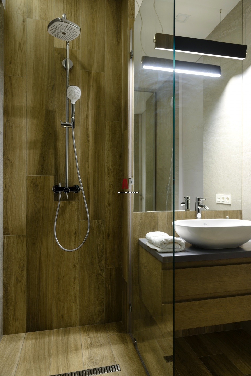 В оформлении гостевого санузла использован керамогранит, имитирующий дерево с его природным рисунком.