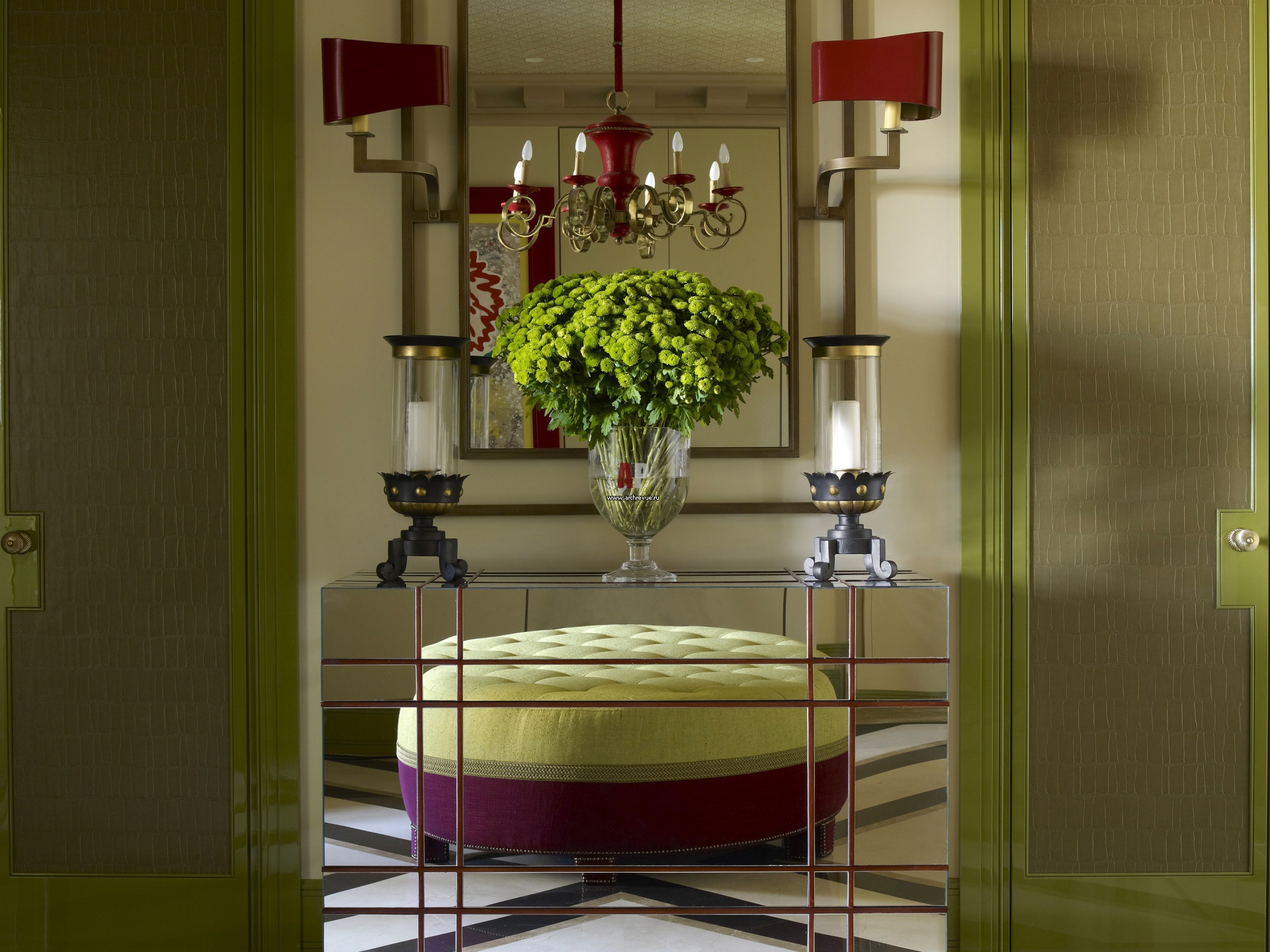 Интерьер парадного холла. Зеркальный комод, Франция, 1950-е годы. Над ним – современное зеркало из Лос-Анджелеса. Симметричные двери из лакированного дерева цвета лайма с кожаными вставками выполнены по дизайну Кирилла Истомина.
