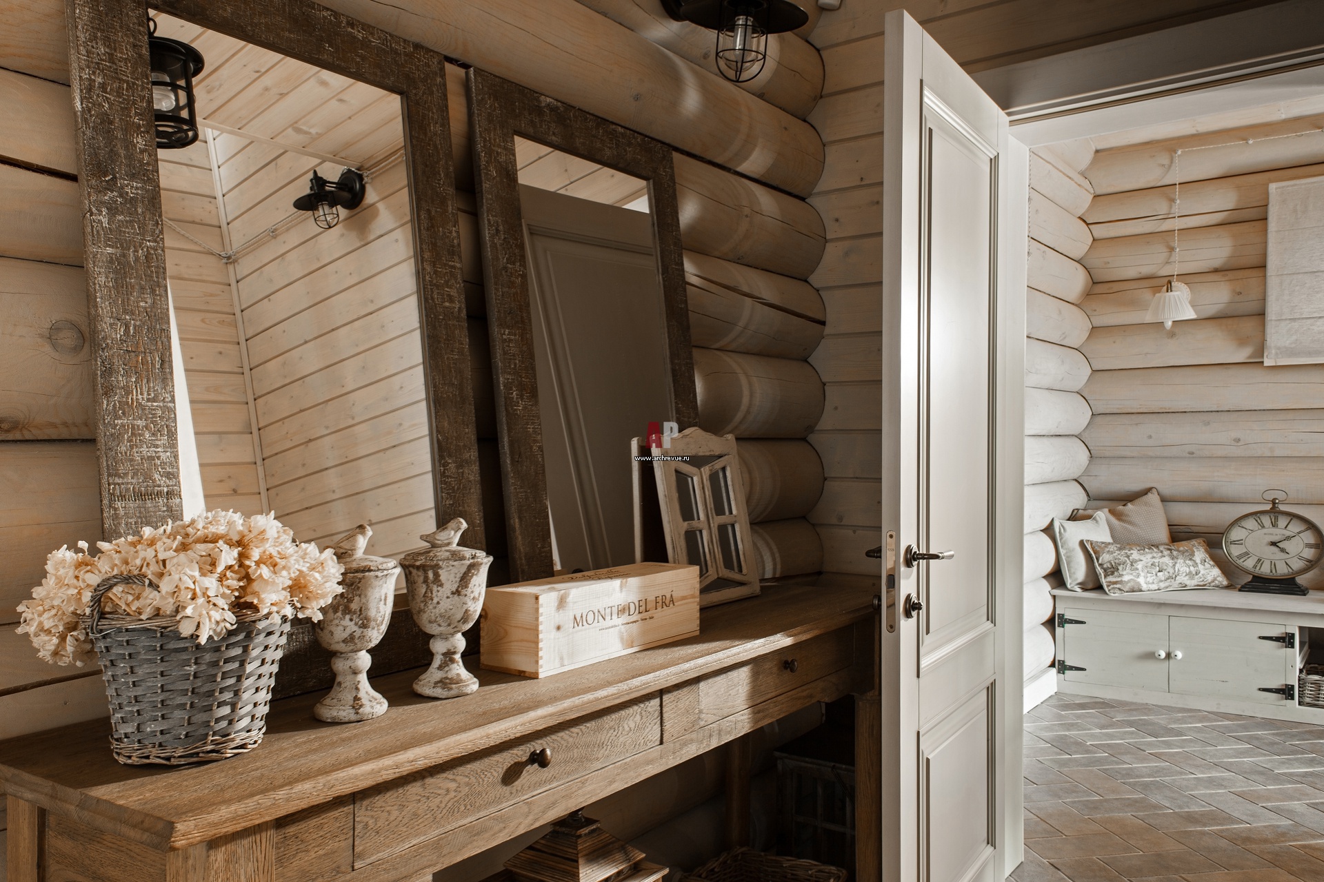 Дизайн интерьера прихожей выполнен в духе прованса. Двери, мебель – белого цвета. Консоль из некрашеного дерева.