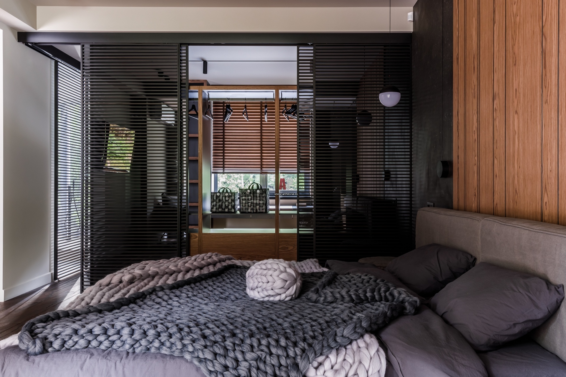 Хозяйская спальня. За реечной перегородкой находится гардеробная.