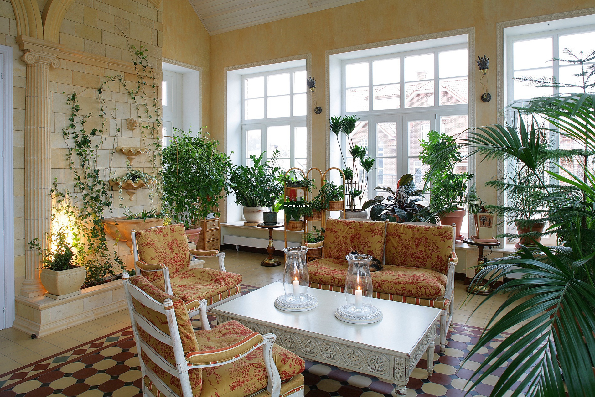 Сходство зимнего сада с итальянскими двориком усиливает классический пристенный фонтан с тремя чашами на увитой лианами стене, выложенной шамотным камнем, поставщик «Кромлех».