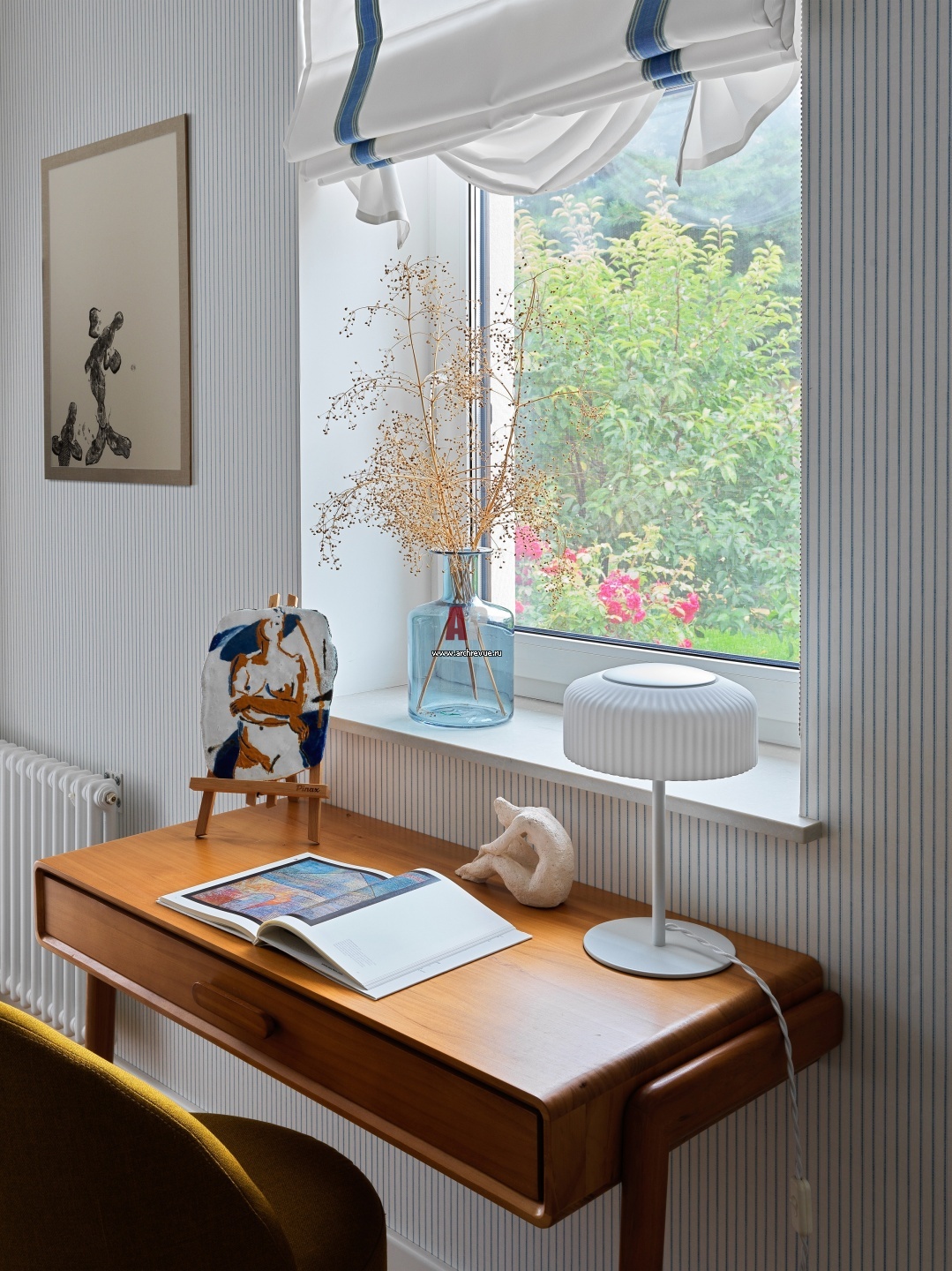 Под окном в спальне размещен консольный столик в стиле 60-х годов. Он не перегружает пространство и выполняет функцию рабочего стола.