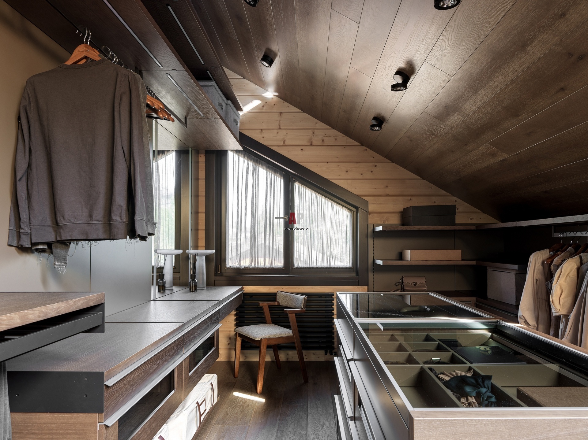 Современное шпале для молодой семьи. Интерьер гардеробной в мансарде.