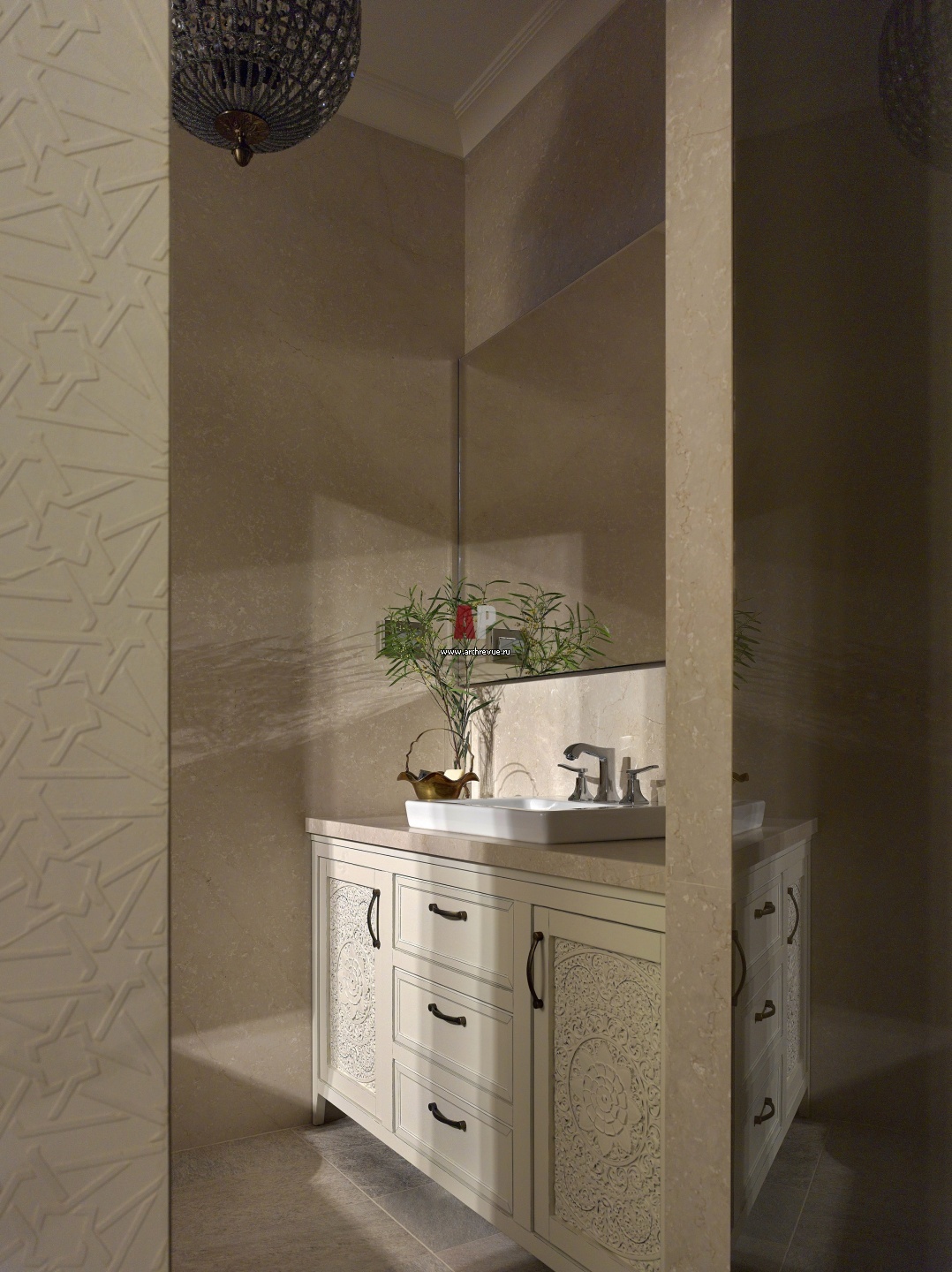Марокканский санузел при бассейне. Тумба под раковину с ажурной восточной резьбой сделана на заказ. Стены частично оформлены лепниной с характерной орнаментикой.