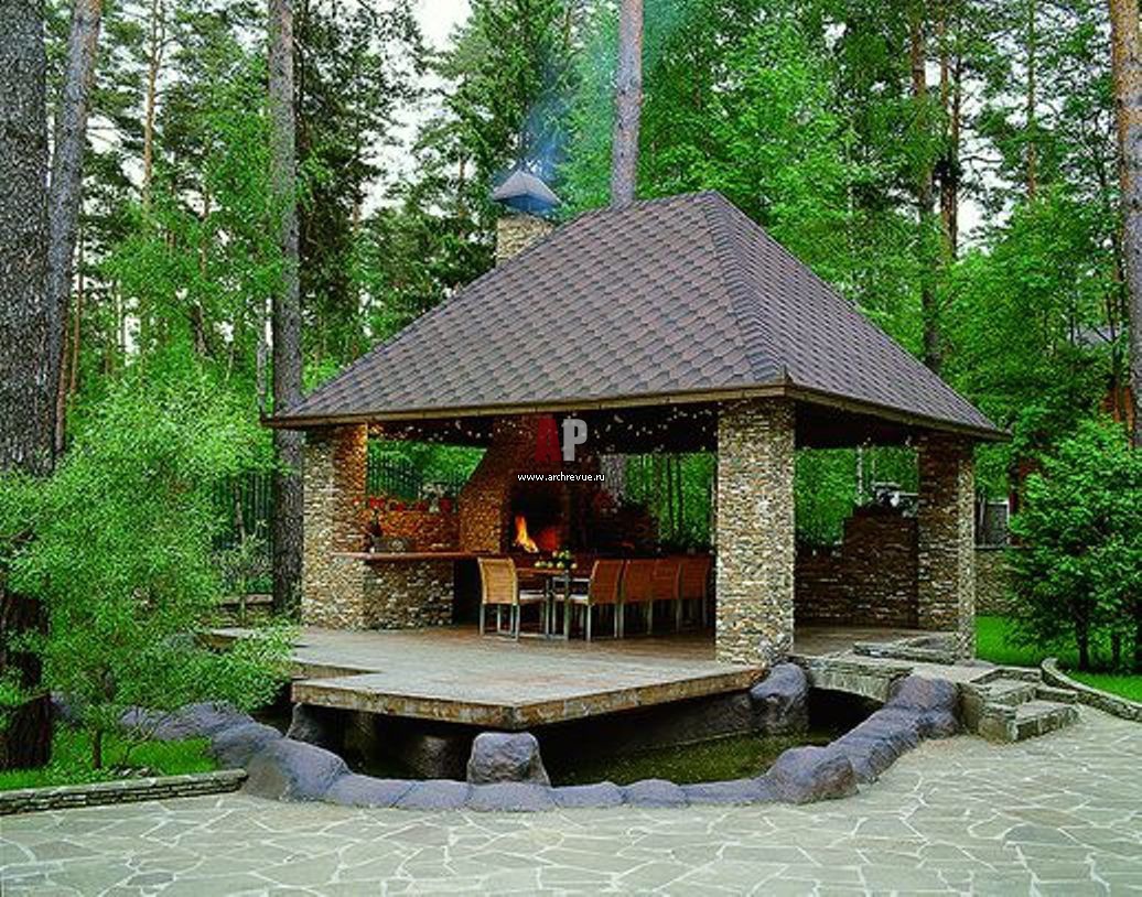 Рядом с отделанной песчаником беседкой размещен водоем, в котором круглый год живут золотые рыбки.