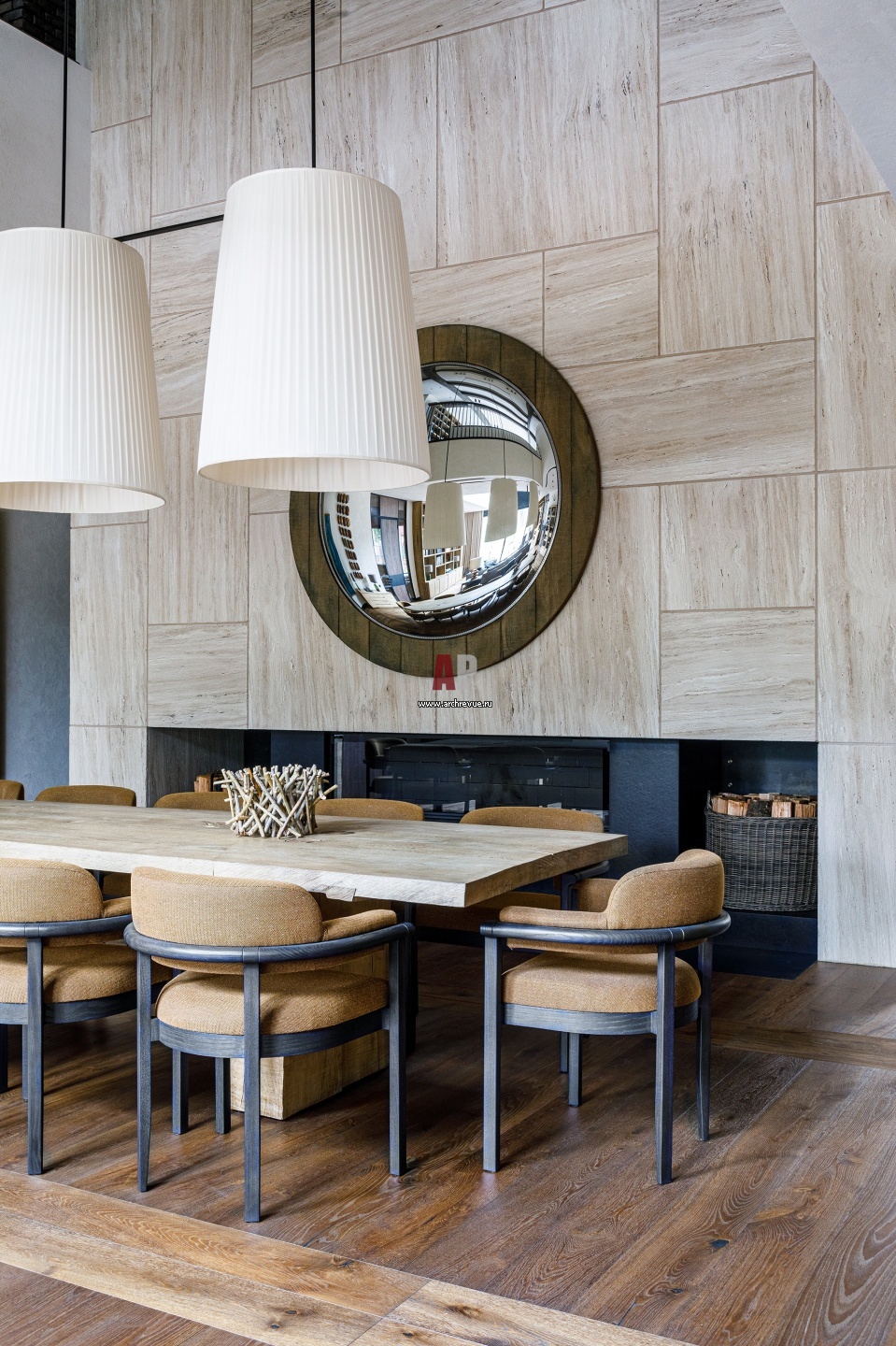 Каминная группа. Центральный элемент общей зоны – 7-ми метровый камин, облицованный бежевым травертином. Крупный формат светильников и выпуклого круглого зеркала над камином помогает сбалансировать объемы в открытом двусветном пространстве.