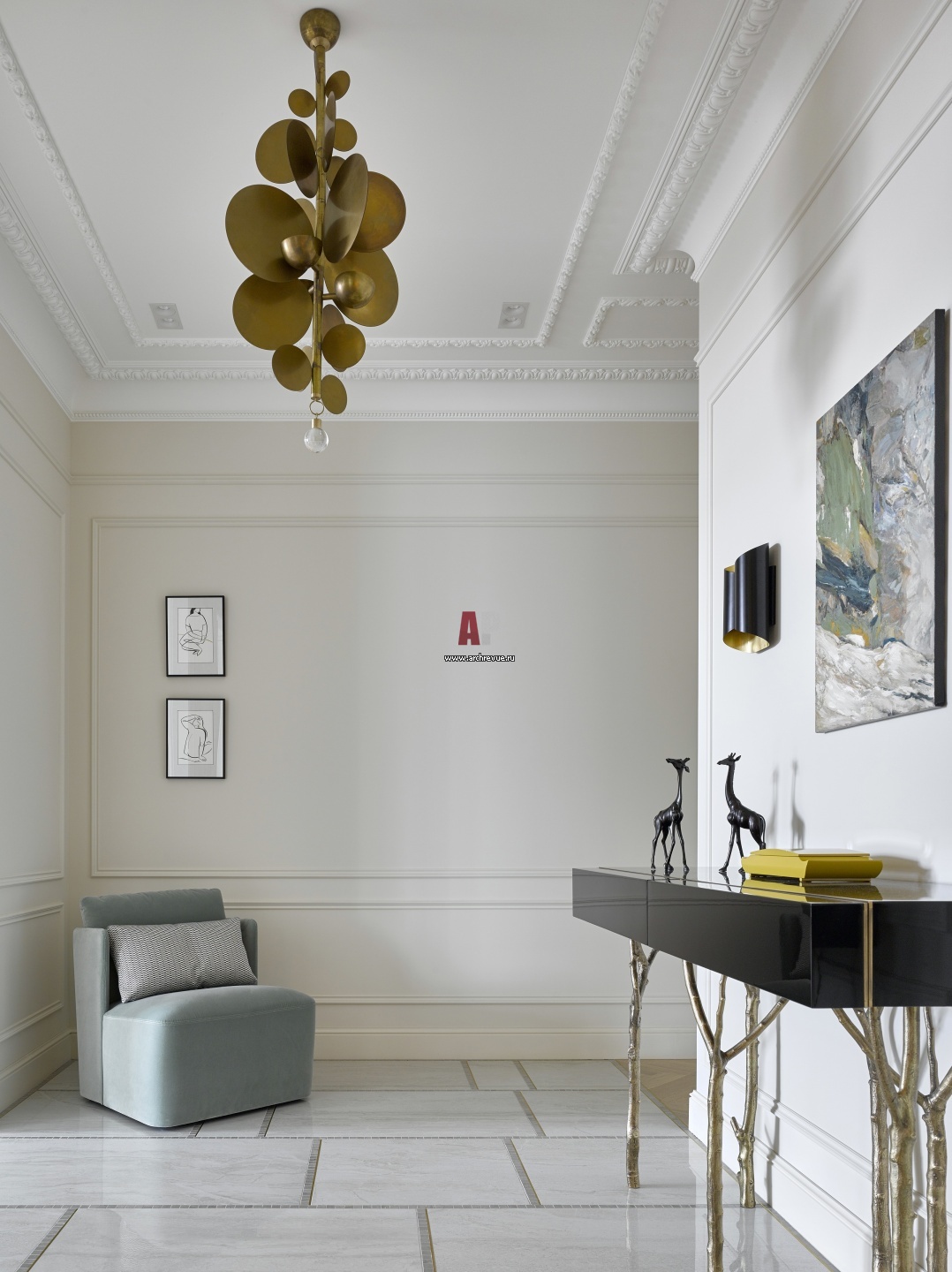 Интерьер прихожей. Кресло, Meridiani. Консоль, Ginger & Jagger. Свет, Visual Comfort & Co.