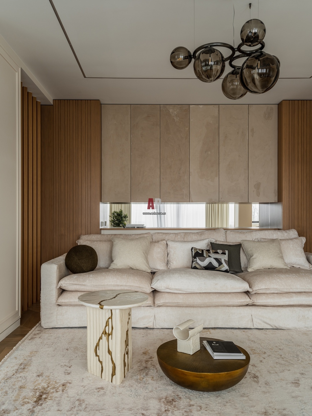 Квартира в стиле софт-минимализм для семьи с двумя детьми. Интерьер гостиной с природными фактурами и мягкой палитрой.