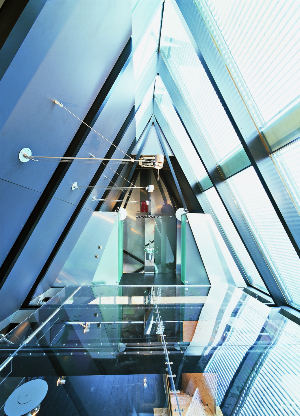 Санузел в мансарде со стеклянным полом и острой кровлей. Стеклянные капсулы, в которых скрыты душевая и санузел образуют подобие портала.