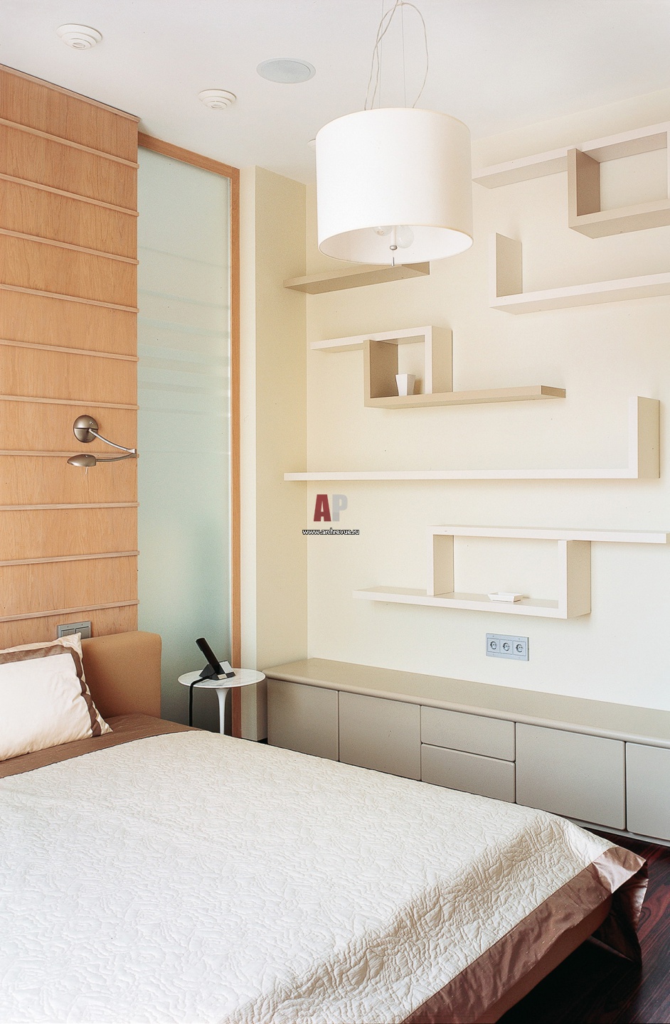 Детская в современном стиле. На стене – модульная конструкция из полок. Она визуально усложняет лаконичный интерьер.