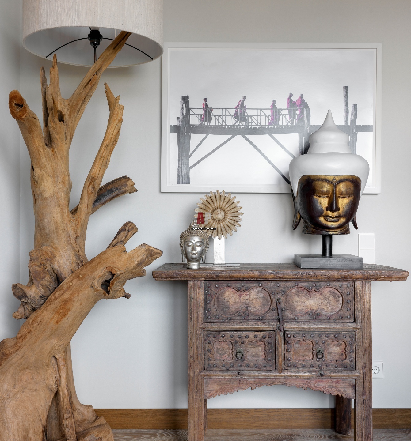 Комната для йоги с элементами этники, индийским комодом и светильником в виде дерева.
