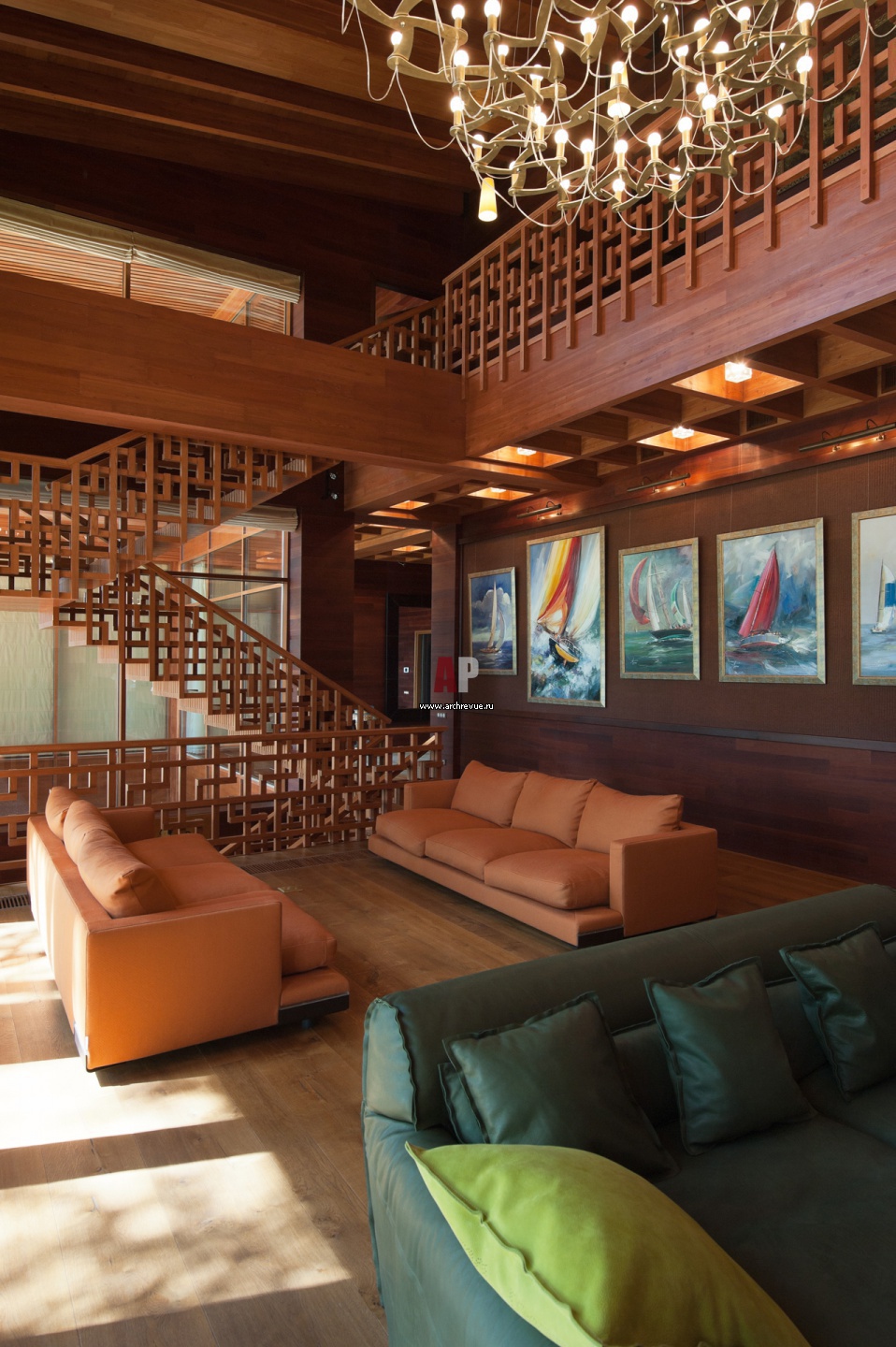В пространстве гостиной находится ажурная лестница, которая связывает три этажа дома. В рисунке ограждения читается традиционный китайский орнамент.