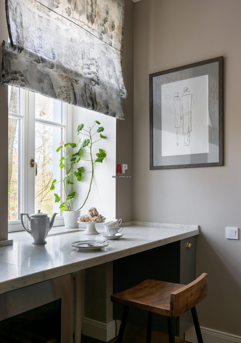 Преимущество маленькой кухни – два окна с видом на царский парк. Их объединяет широкая столешница-подоконник с зоной для завтраков. Стул, винтаж.
