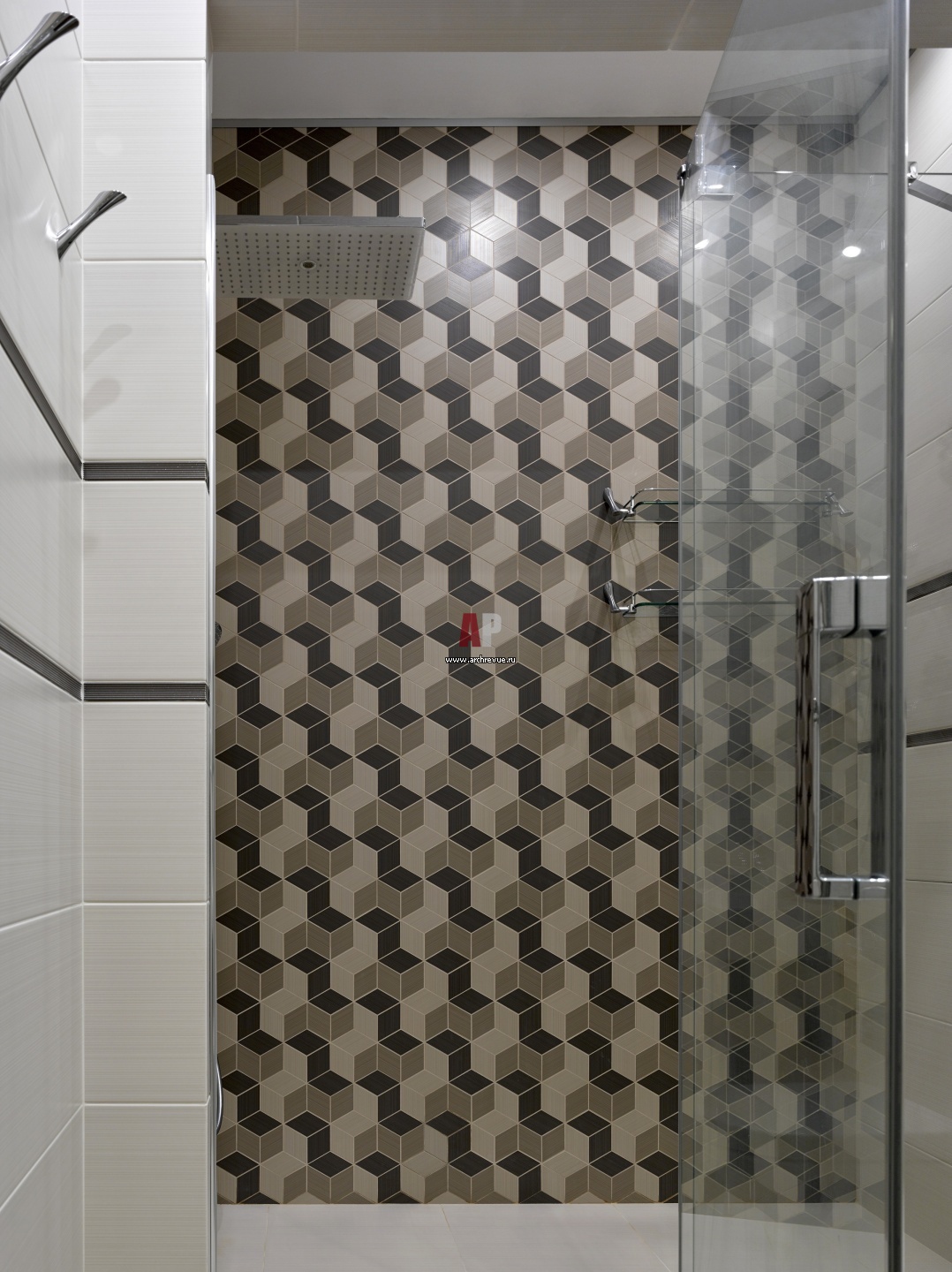 Интерьер душевой в родительской ванной комнате. Стена оформлена каменной мозаикой природных оттенков с геометрическим рисунком.
