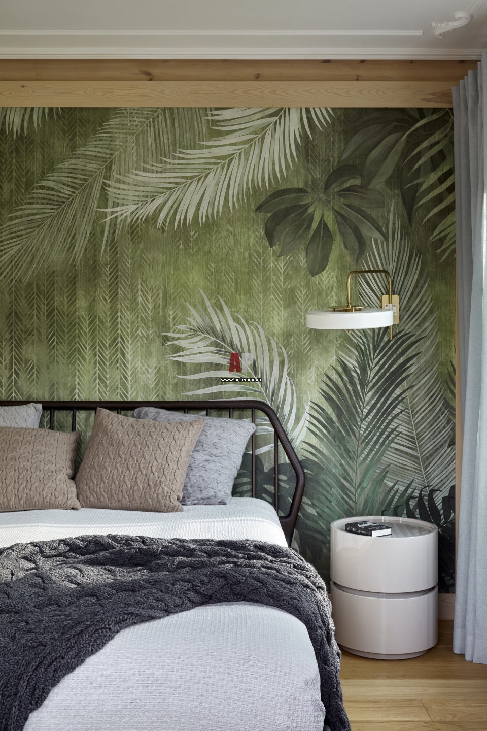 Стена за изголовьем кровати в хозяйской спальне оформлена обоями ручной работы с растительным рисунком. Бра, Bert Frank.