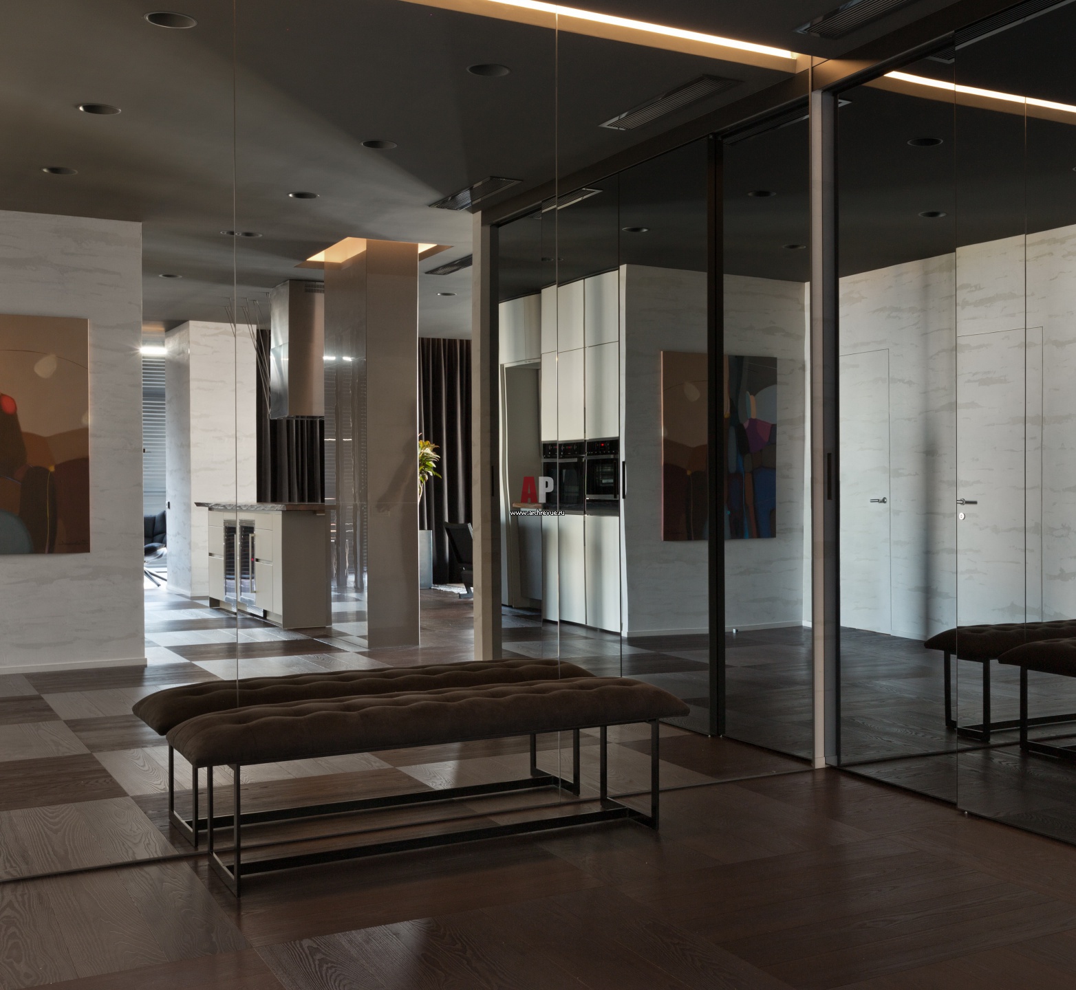 Зеркала зрительно расширяют пространство прихожей. Зеркальными панелями маскируются гардероб для верхней одежды и технические помещения.