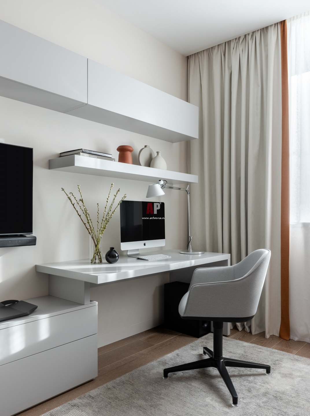 Рабочее место в комнате сына. Стол выполнен на заказ. Стул, Vitra. Настольная лампа Artemide.
