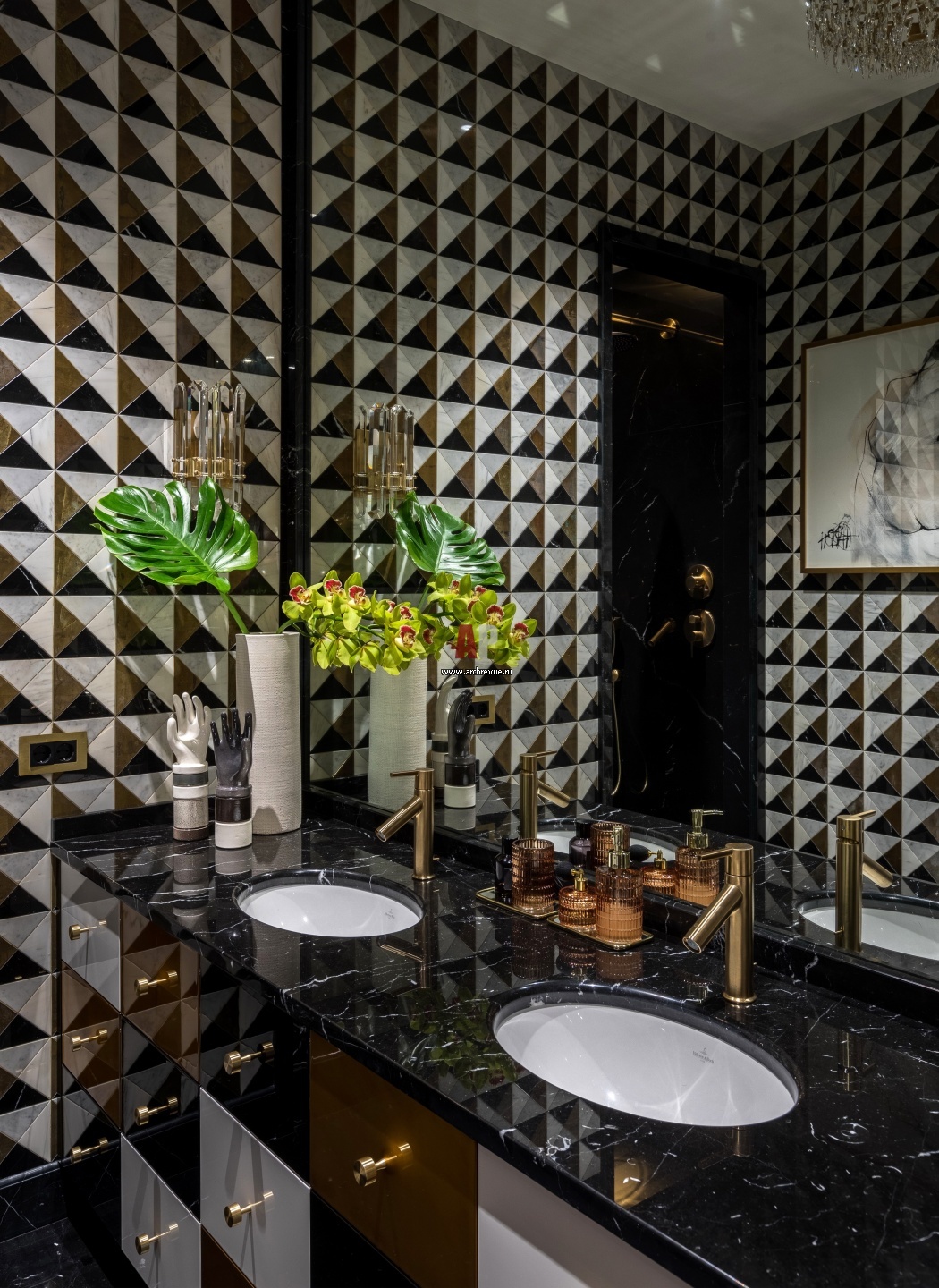Интерьер хозяйской ванной комнаты. Сантехника, Villeroy & Boch. Бра, Kelly Wearstler, модель Aerin Lauder Bonnington. Картины, Martine Chaperon.