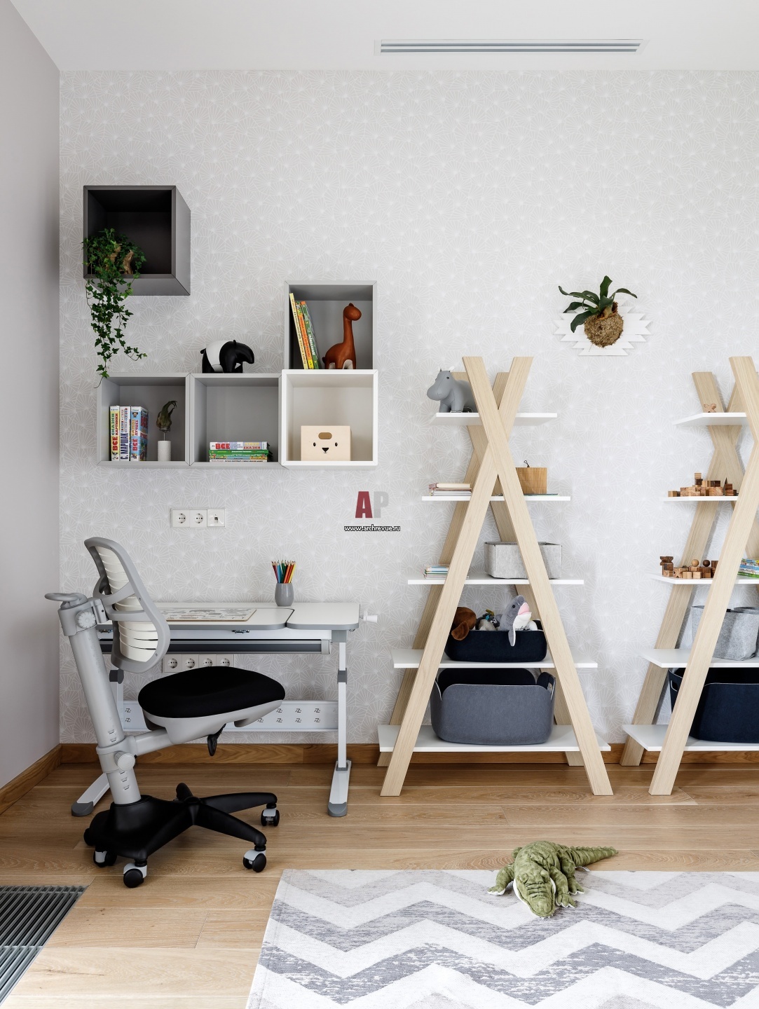 Рабочая зона в детской. Обои с нейтральным рисунком в бежевых тонах. Стеллажи-вигвамы сделаны на заказ. Полки над столом, IKEA.