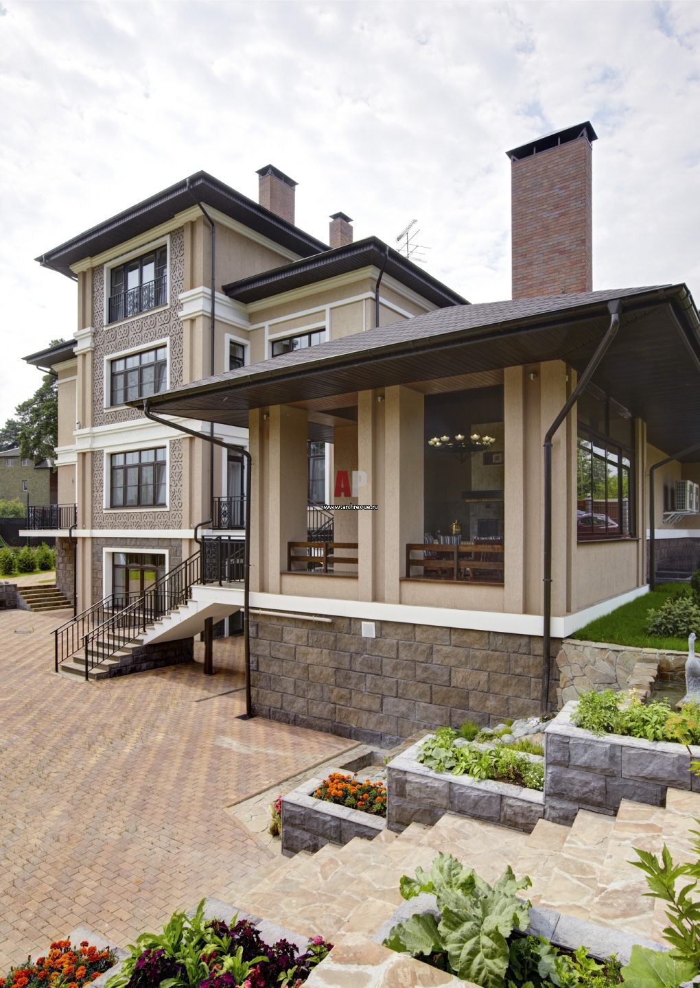 Фото фасада трехэтажного усадебного дома в современном стиле. Веранда с зоной отдыха и барбекю размещена на отдельном уровне, она соединена с жилыми помещениями крытым переходом с лестницей.