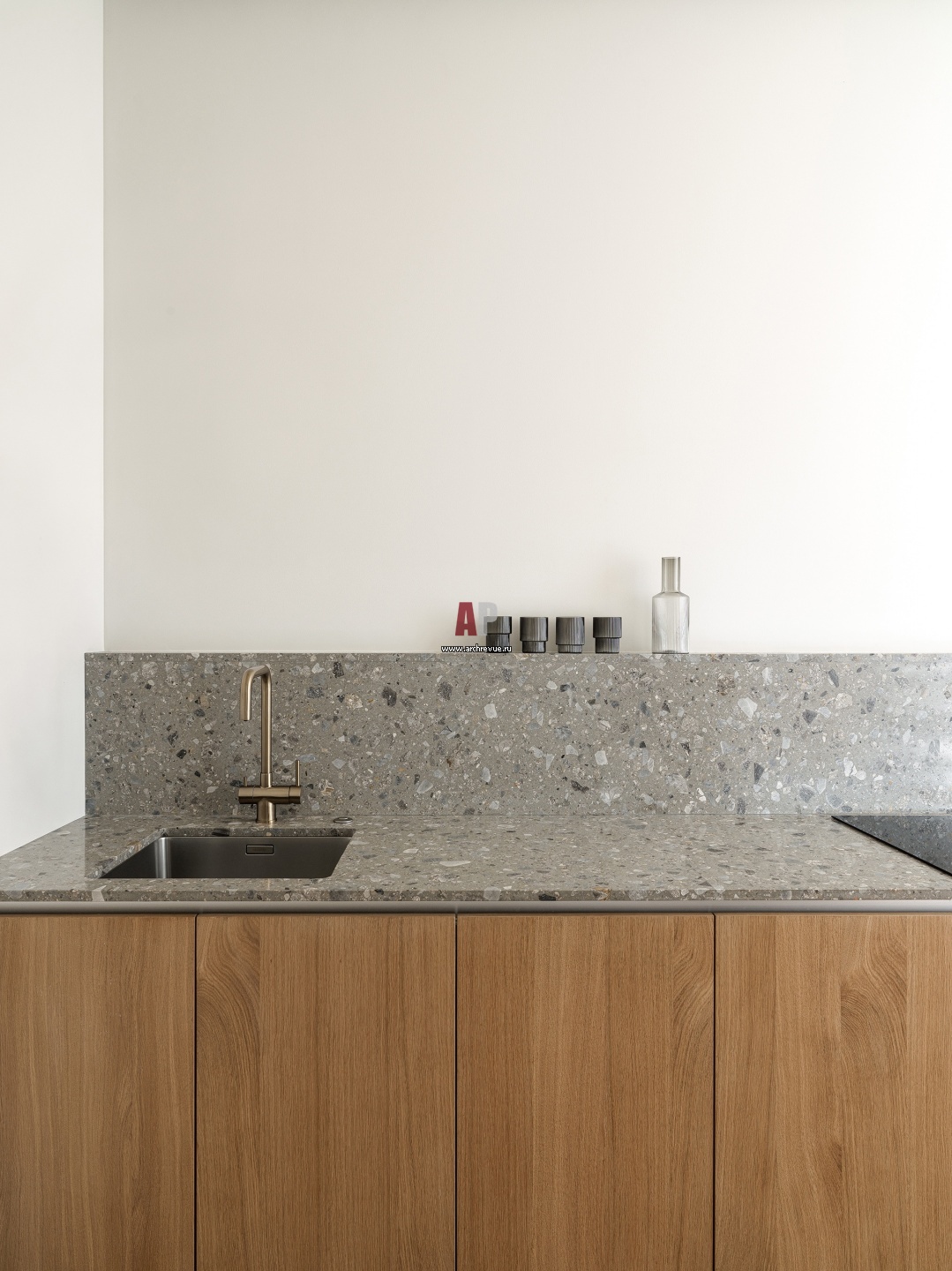 Столешница и фартук кухни изготовлены из слэба итальянского терраццо.