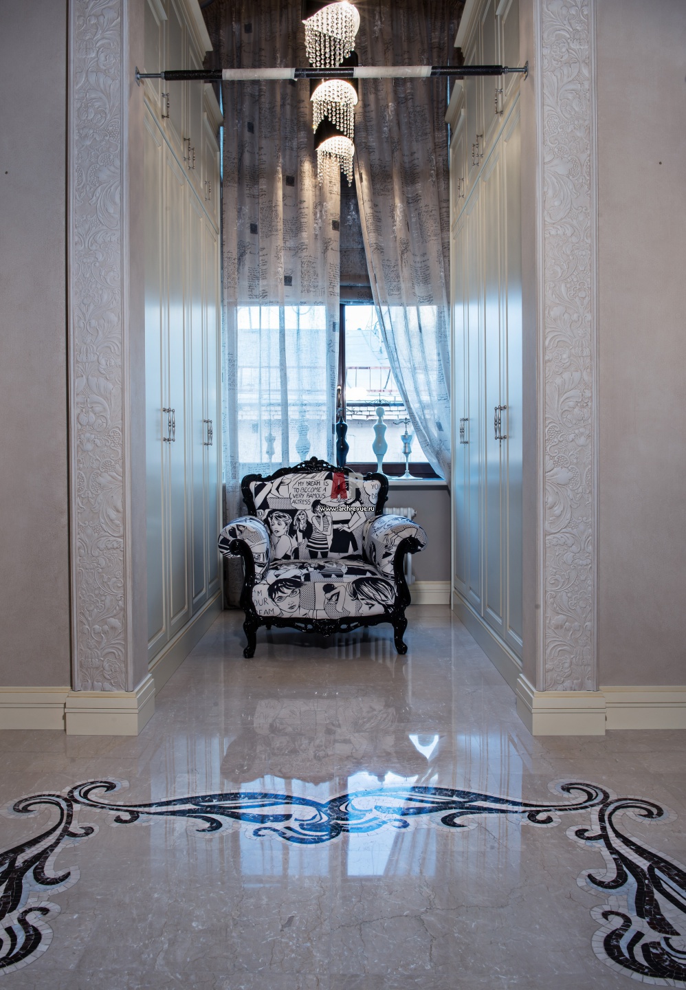 Пол холла украшен мраморной мозаикой ручной работы. На стенах – светлые буазери с растительным орнаментом, выполненные по эскизам авторов проекта.