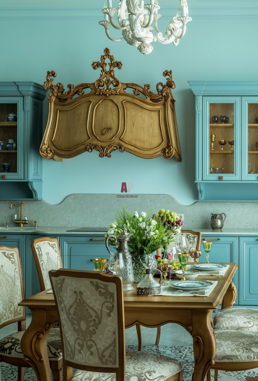 Заказчице понравился итальянский кухонный гарнитур голубого оттенка. Модель из массива дерева, в покраске с декором из резных накладных элементов. Зона плиты выступает вперед от остальных тумб, что подчеркивается плавными линиями кухни. Коммуникации для вытяжки имеют выход в стене, а не в потолке, отчего резная панель из массива ореха словно парит в воздухе.
