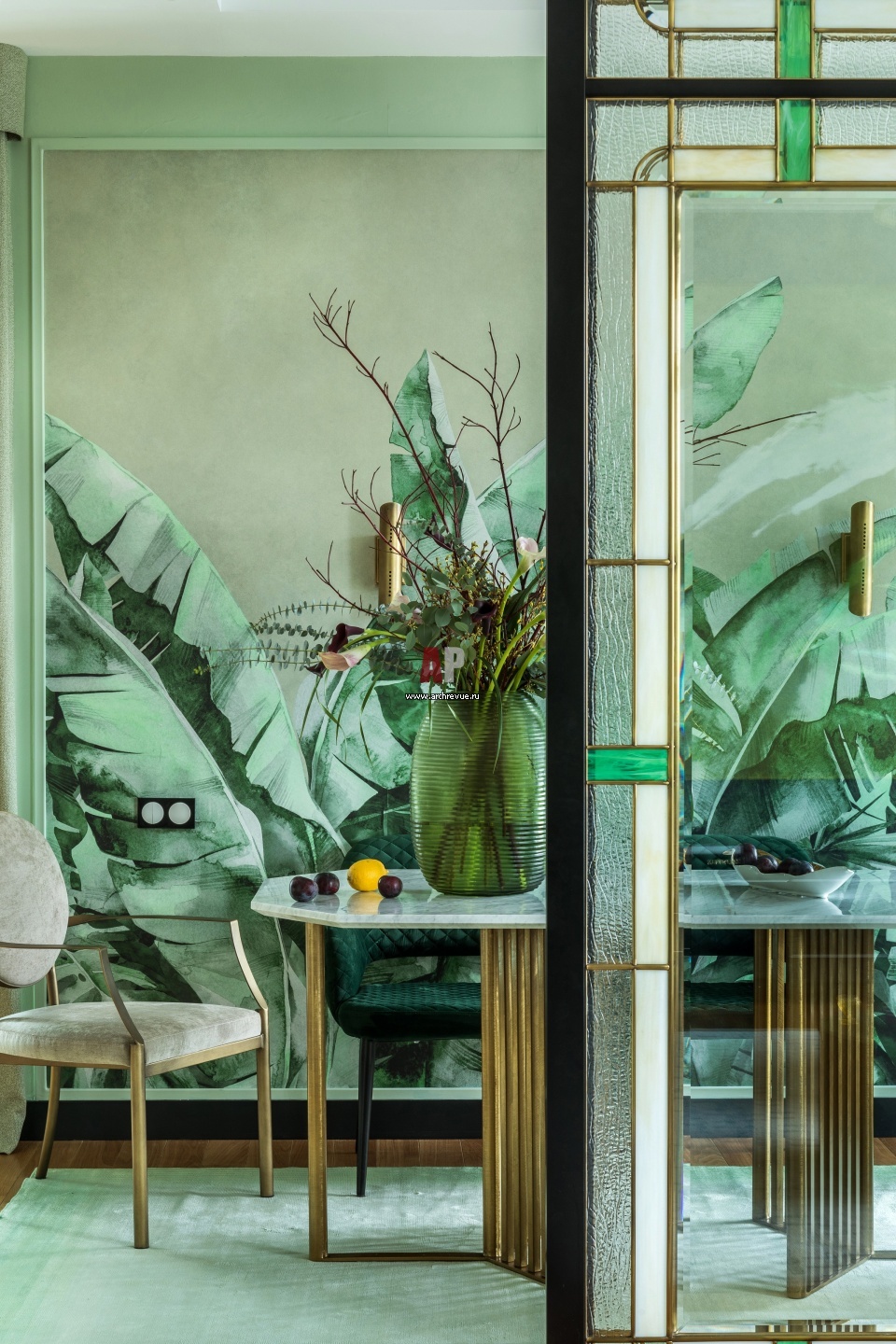 Витраж отделяет зону отдыха от столовой. Стена в столовой оформлена яркой фреской с изображением банановых деревьев. Ваза на столе выполнена из зеленого стекла. Бра из латуни, на заказ.