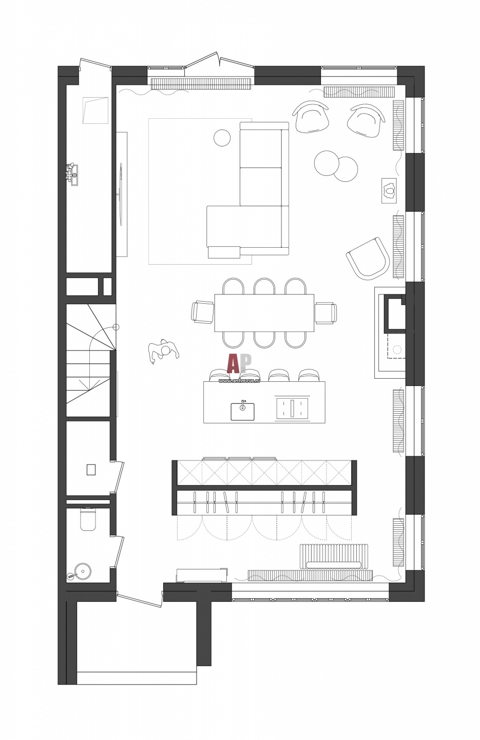 Планировка 1 этажа 4-х этажного таунхауса в коттеджном поселке Park Fonte на Истре.