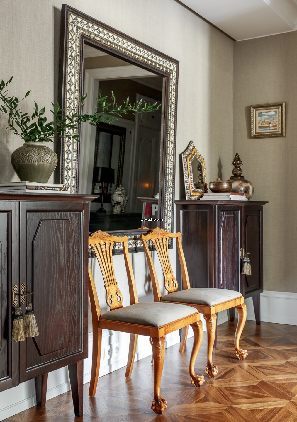 В неоклассическом интерьере соединяются предметы разных эпох и культур: зеркала в рамах с восточным орнаментом, стулья в стиле чиппендейл, серебряные антикварные бра.