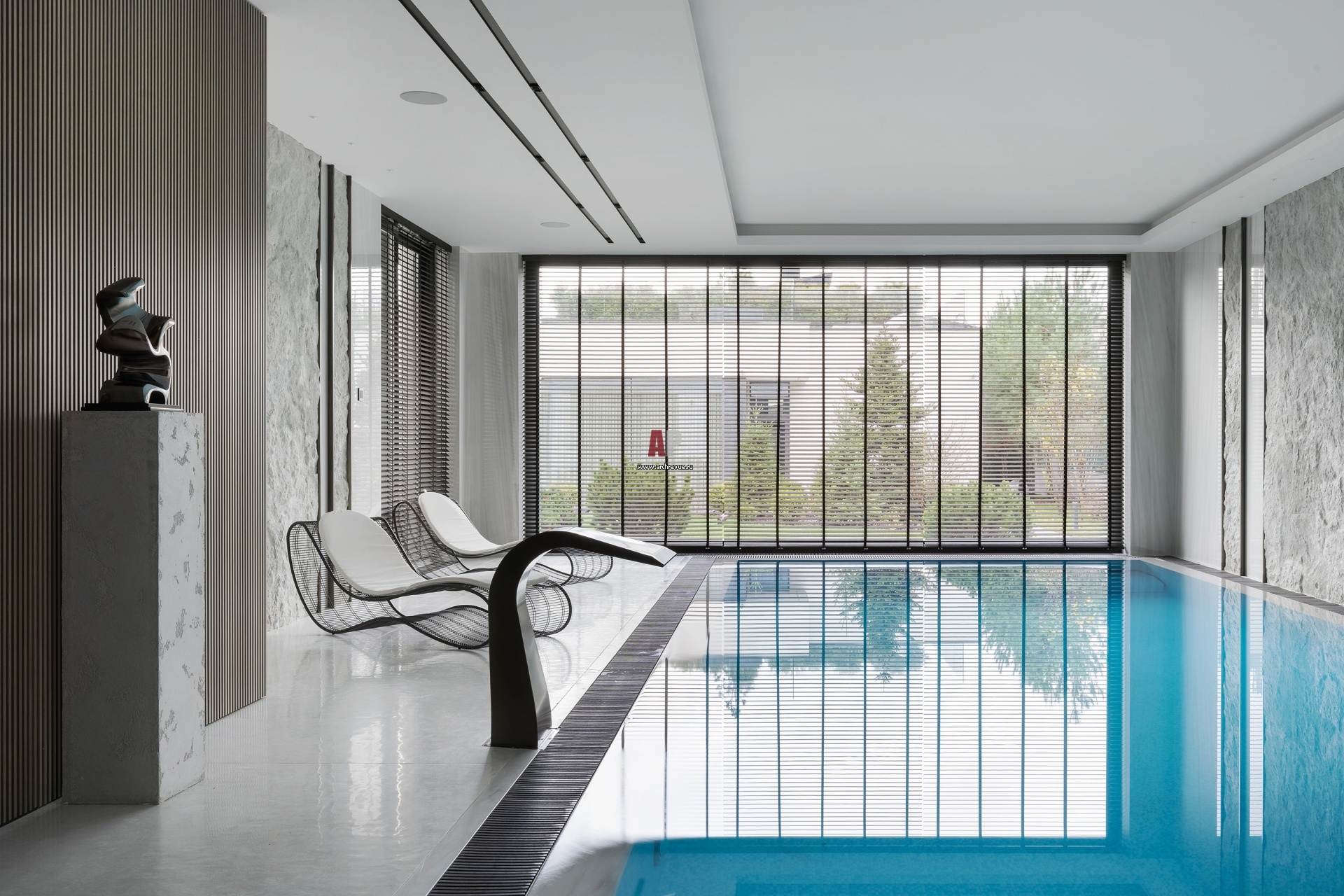 Бассейн на первом этаже. Стены оформлены реечными панелями, за которыми скрываются шкафы, а также покрытием с фактурой известняка и подсветкой. Ниша для монтажа решетки перелива бассейна и переход в чашу выполнены из акрилового агломерата Grandex. Такое решение позволило реализовать узлы идеально, без швов и шероховатостей.