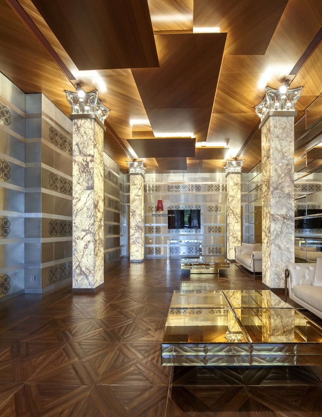 Интерьер домашнего кинотеатра. Колонны облицованы камнем с подсветкой, стены декорированы металлом с перфорацией. Наборный паркет из массива ореха. Диваны, журнальные столики, Visionnaire.