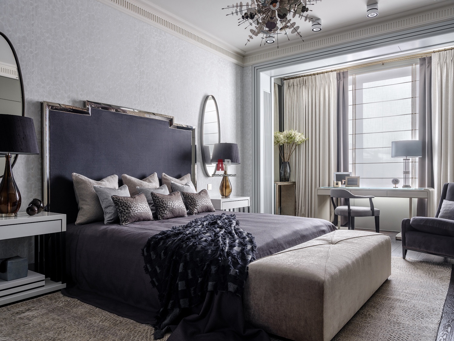 В одной из спален использовались обои ручной работы из коллекции Caledonia, разработанной Анной Агаповой и Олегом Клодтом , произведены в коллаборации с компанией Holland & Sherry.
