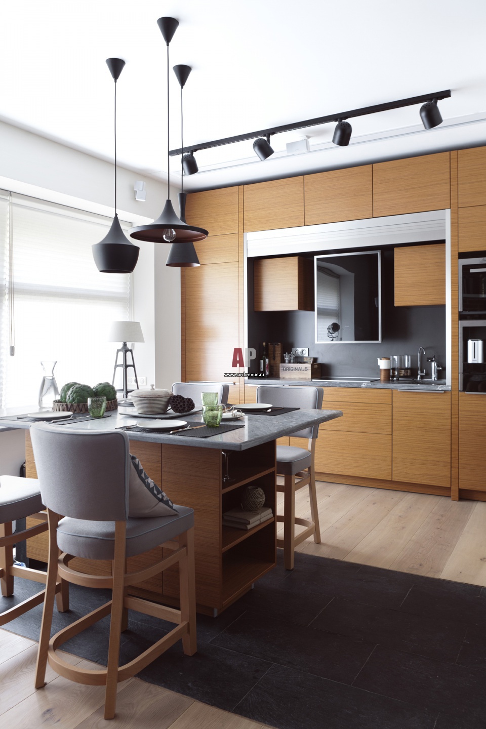 Интерьер кухни в квартире-студии. Остров кухни служит также столом рабочим. Его столешница выполнена из камня. В зоне кухни в потолок вмонтирован выдвижной экран домашнего кинотеатра.