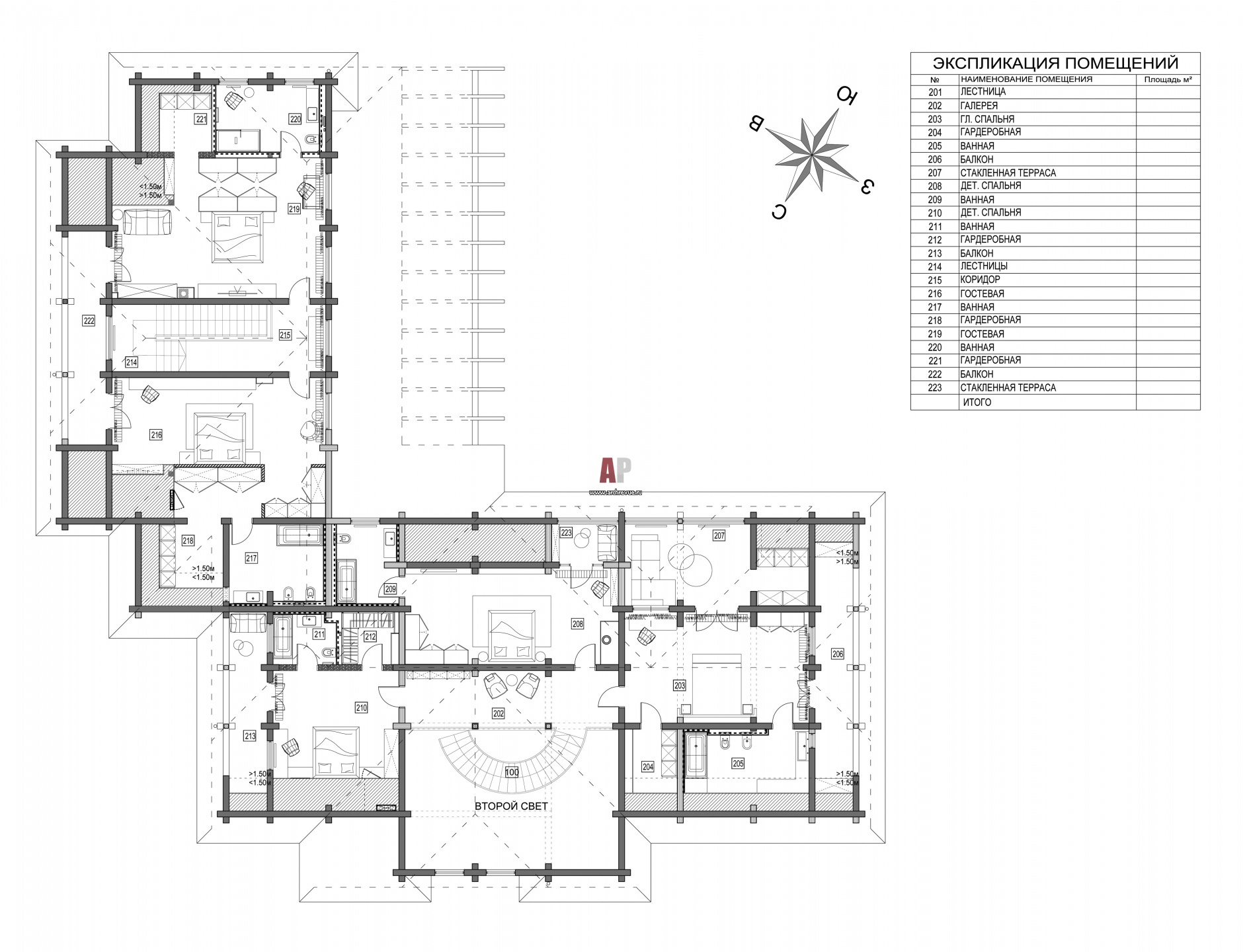 План второго этажа двухэтажного дома на Алтае. Общая площадь - 975 кв. м.