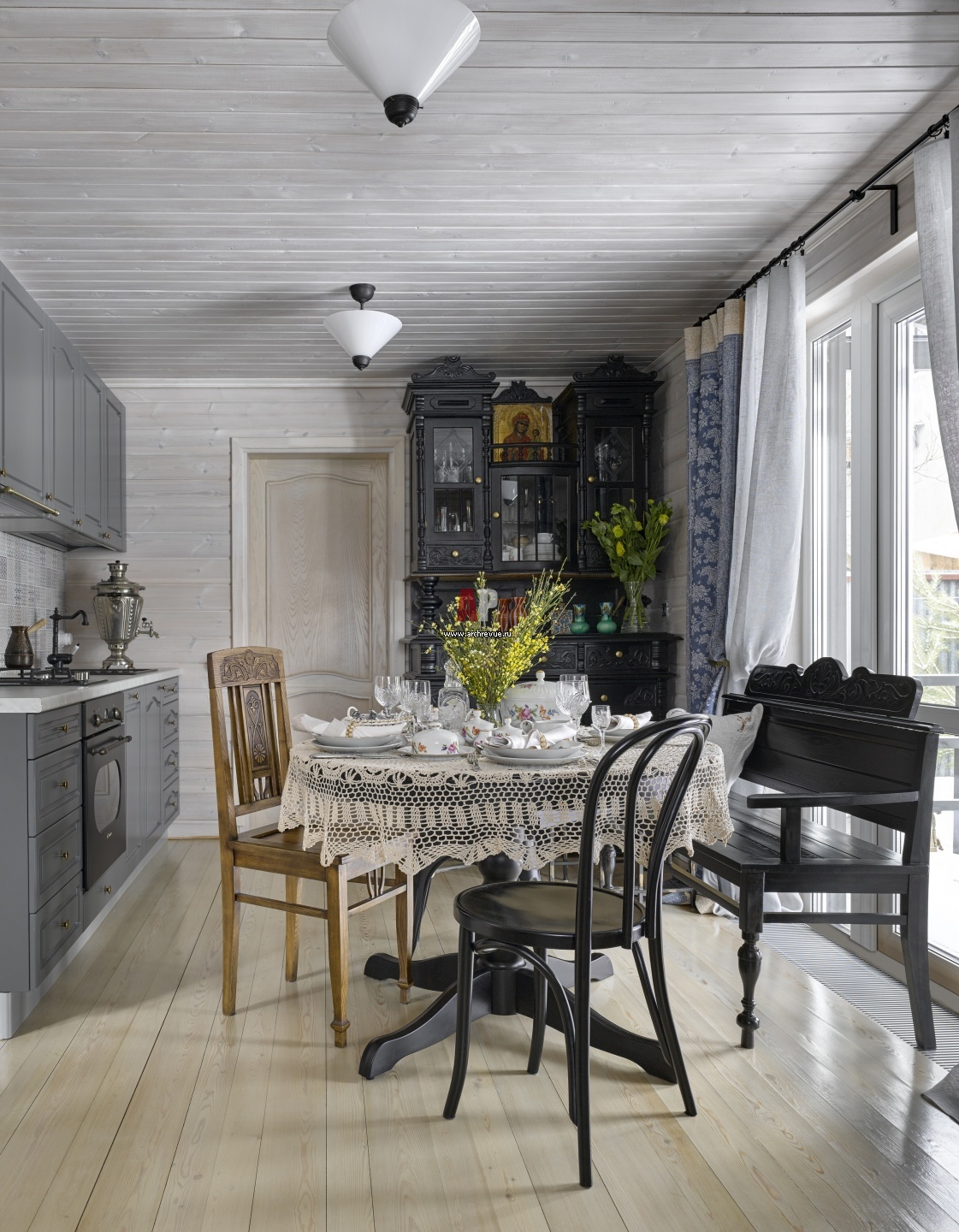 Проходная кухня-столовая. Кухонный гарнитур серого цвета с неоклассическими фасадами сделан на заказ. Скамейка, буфет, деревянный стул с резьбой — винтаж. Черный венский стул, Crate and Barrel.