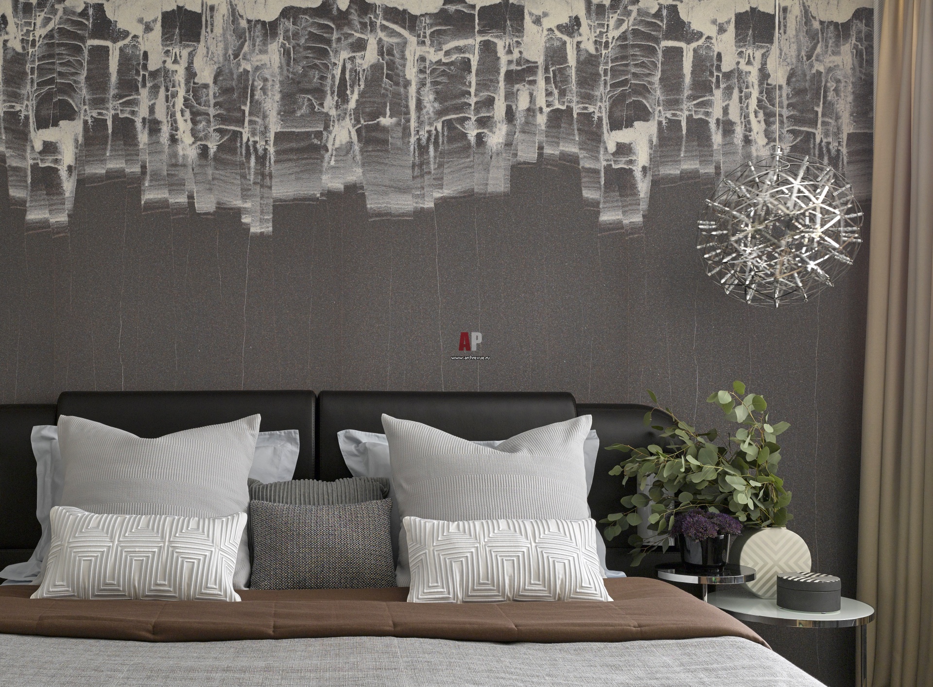 Акцент хозяйской спальни – обои по дизайну Maison Martin Margiela с вкраплением слюды и абстрактным рисунком.