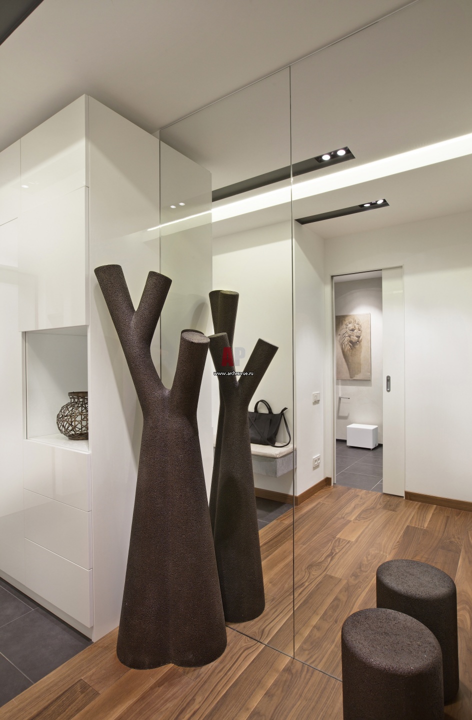 Чтобы зрительно увеличить и расширить похожую на пенал прихожую, одну стену архитекторы полностью облицевали зеркальными панелями, а встроенный шкаф оформили белыми глянцевыми фасадами. Вешалка, табурет, Depst.
