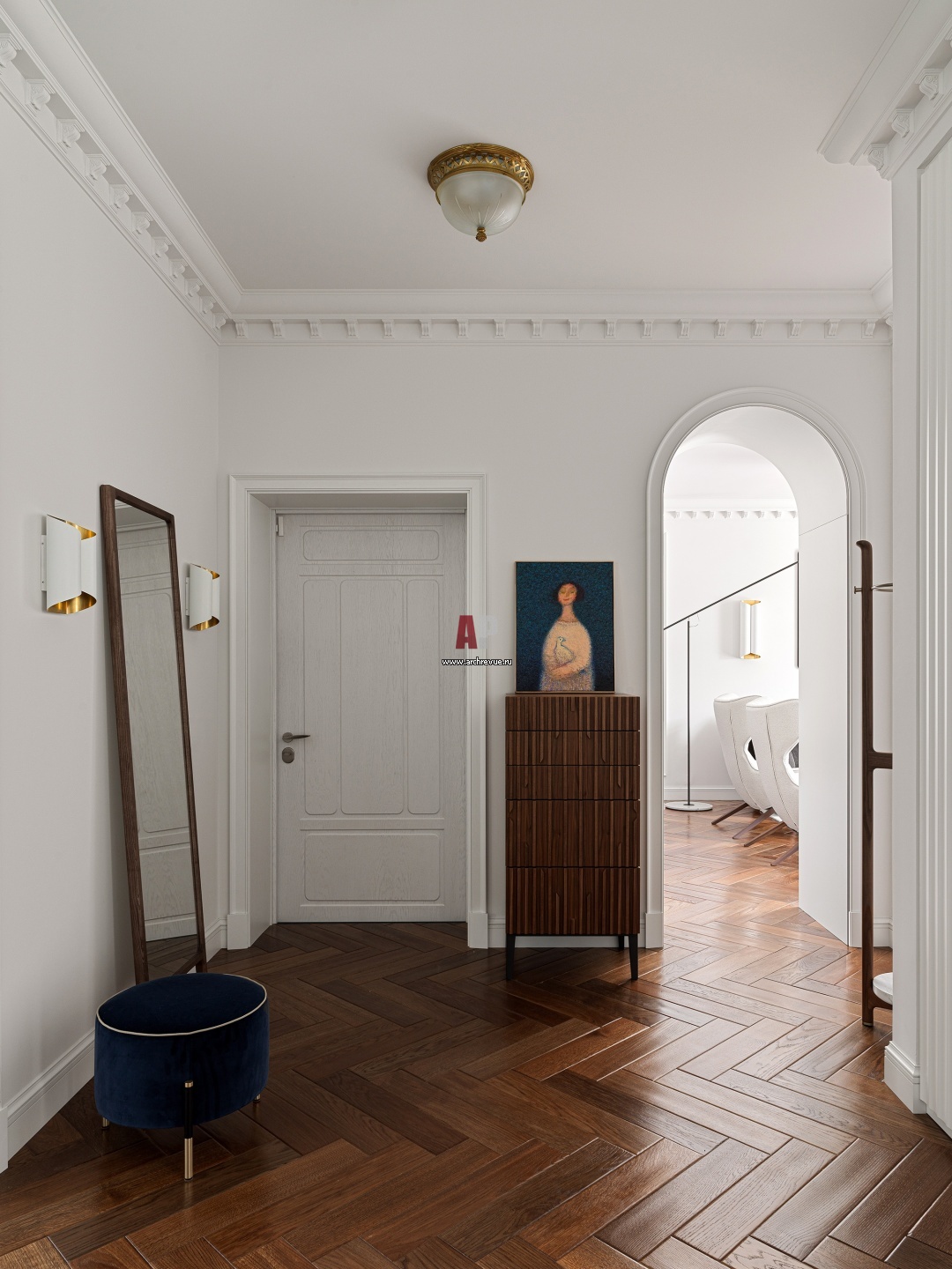 Прихожая. На стенах – краска, Benjamin Moore & Со, колеровка по RAL, белый, матовый. Пуф, Frigerio. Вешалка и напольное зеркало, Porada. Люстры, винтаж, Франция. Бра, Visual Comfort & Co.