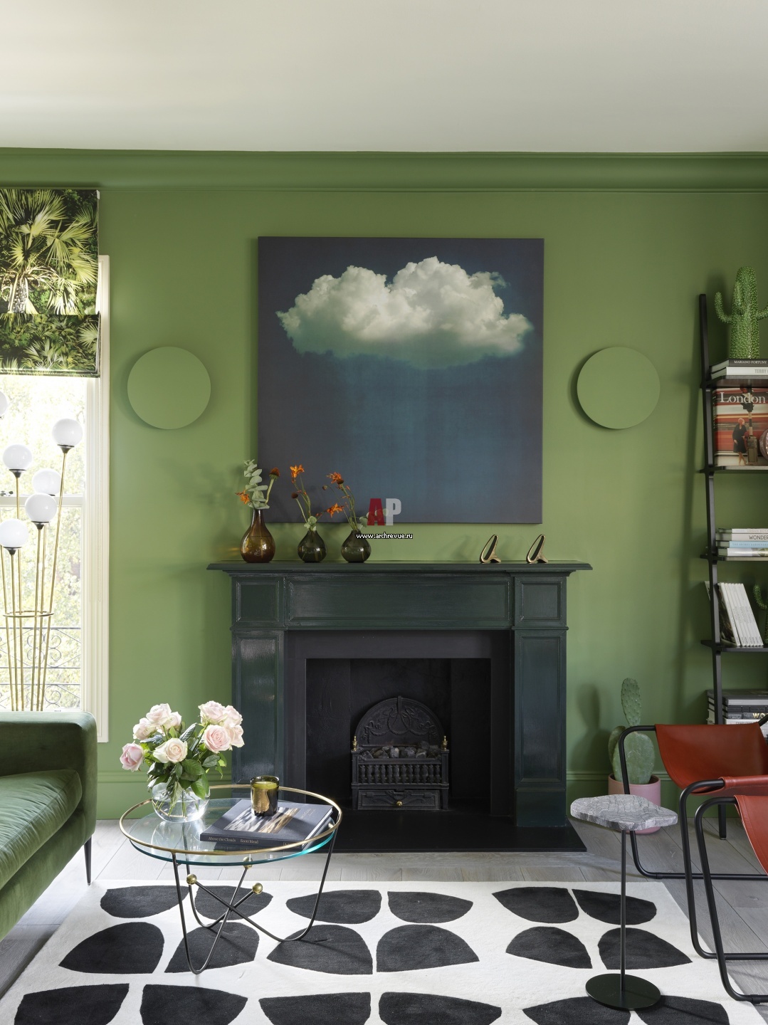Гостиная с традиционным английским камином. Портал из дерева, тонированного в темный изумрудный цвет. Топка чугунная. Над камином – картина с изображением облака.