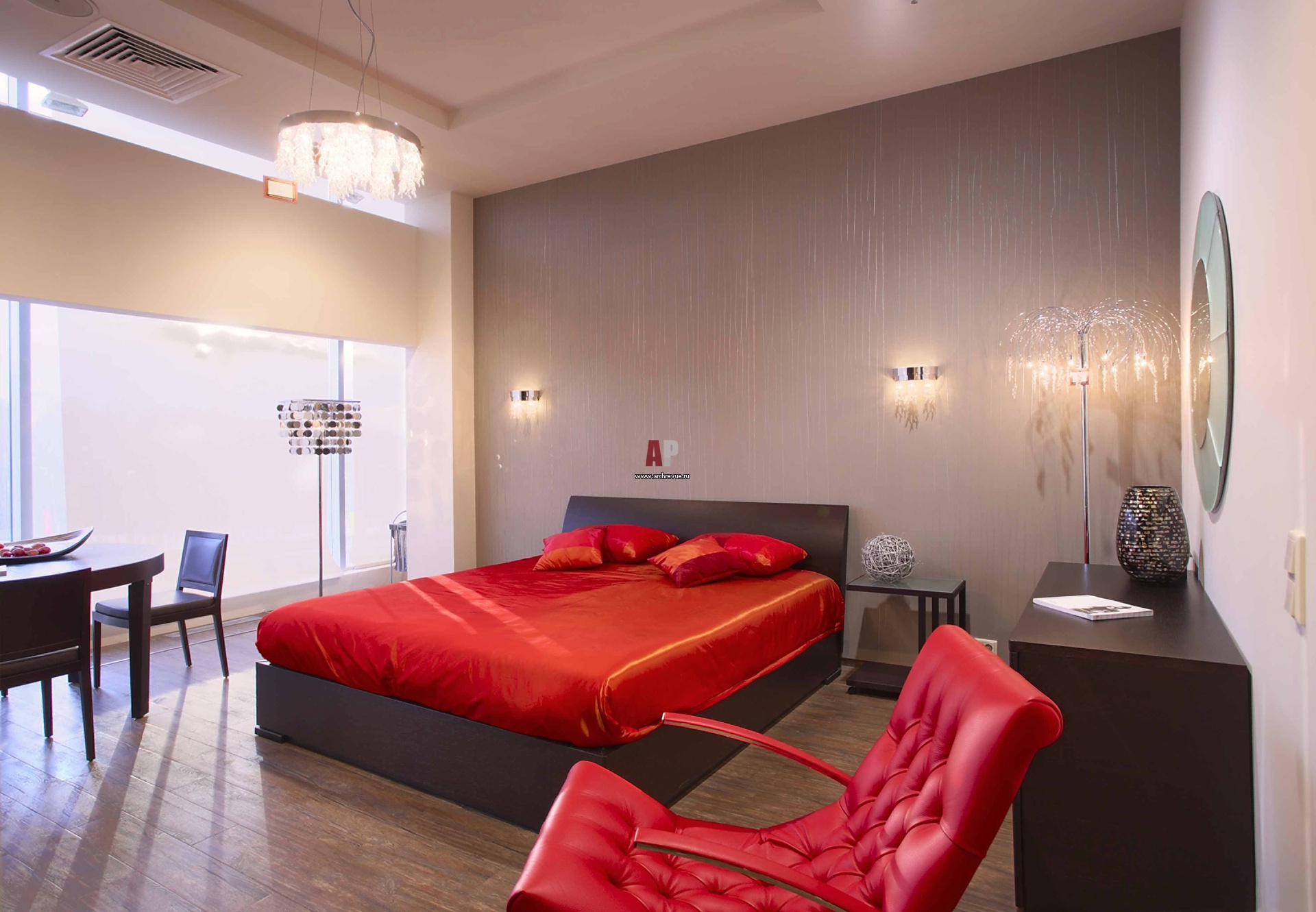Интерьер салона-магазина мебели. Экспозиция современной мебели. Красный текстиль рифмуется с кожаной обивкой кресла.