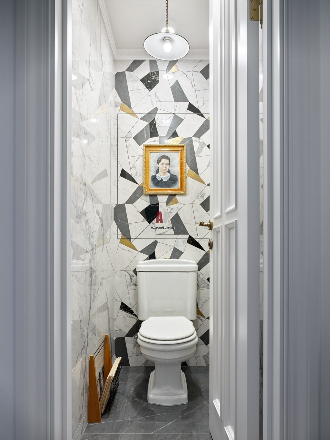 Гостевой санузел. Мозаика с латунными вставками сделана на заказ. Люстра, начало XX века, антиквариат. Газетница, винтаж, собственность хозяев.