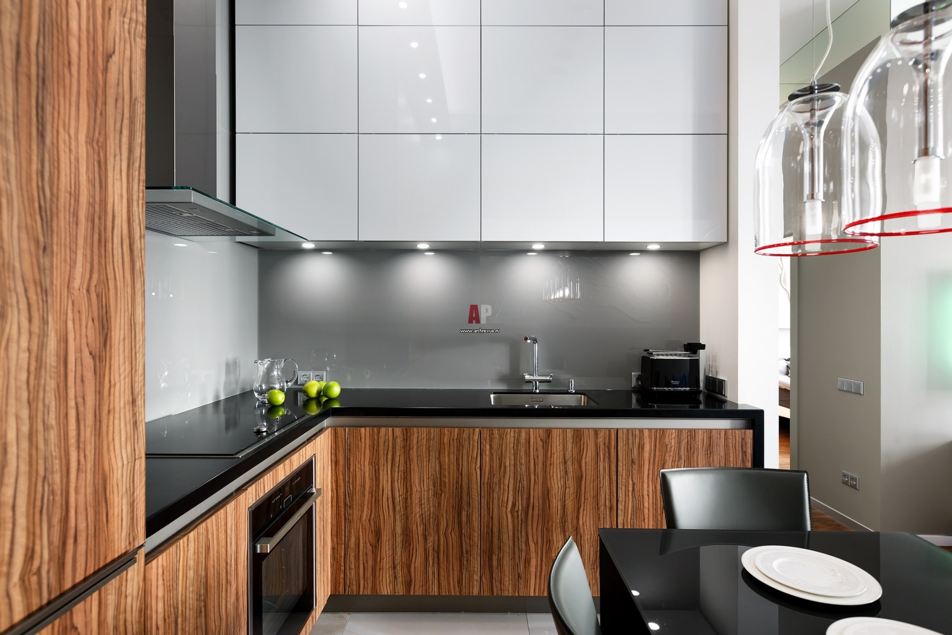 Зона кухни в общей гостиной. Кухня, облицованная шпоном зебрано, выполнена на заказ. Столешница выполнена из черного искусственного камня.