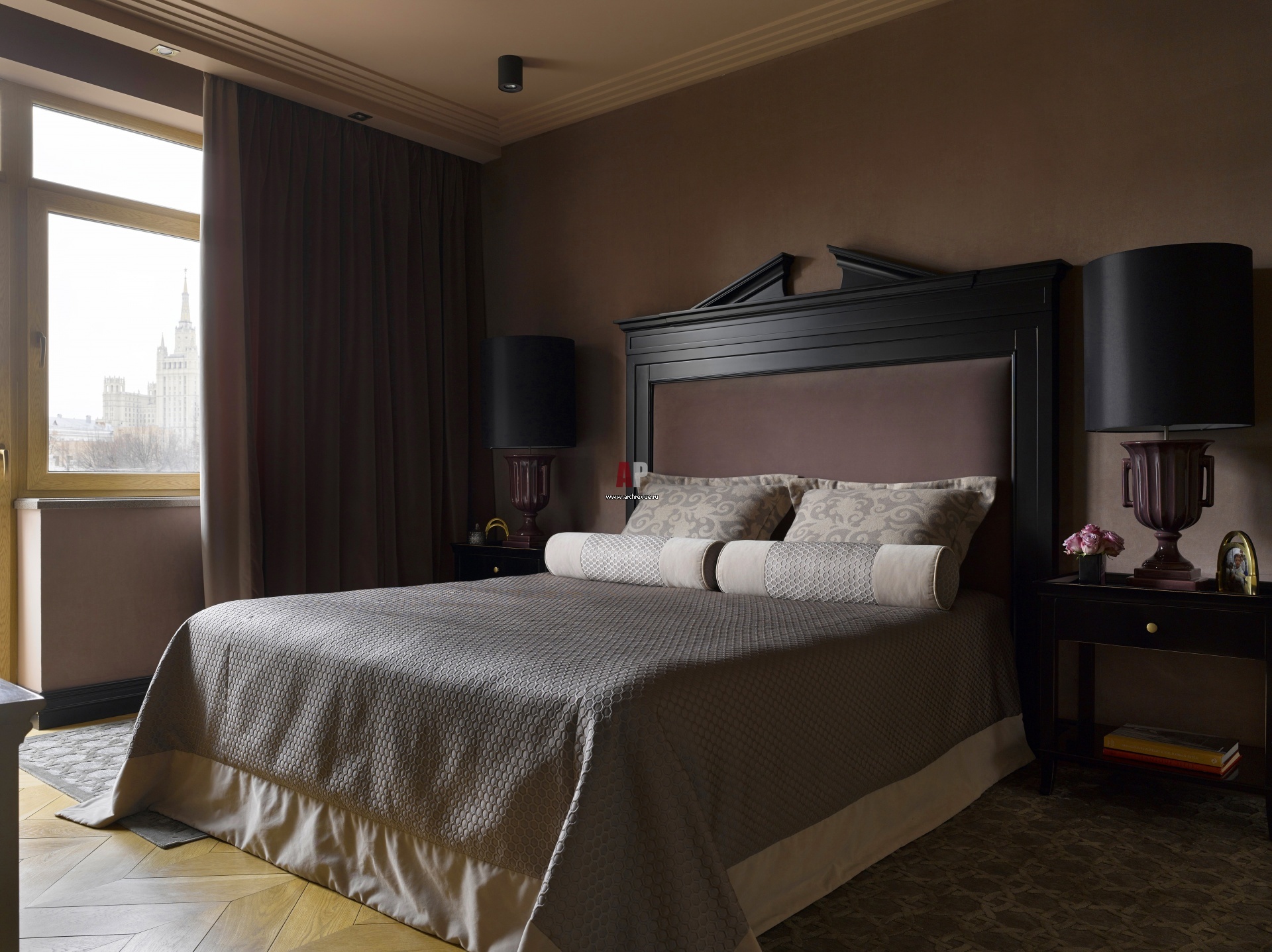 Интерьер хозяйской спальни выполнен в обволакивающих шоколадных оттенках. На стенах – бесшовные обои из алькантары, Arte. Изголовье кровати сделано на заказ в стиле итальянской классики. Основание кровати и матрас, King Koil.