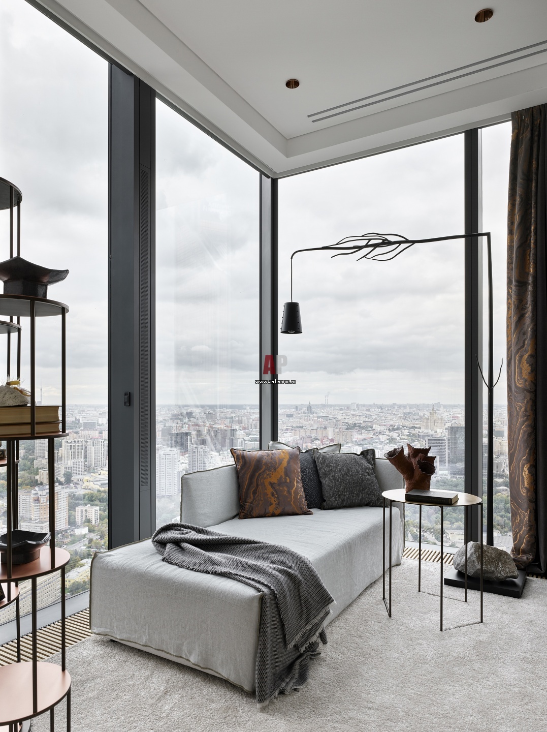 Зона для чтения в спальне с видом на великолепную панораму города. Диван, Gervasoni. Столик, De Castelli. Торшер, Brand van Egmond.