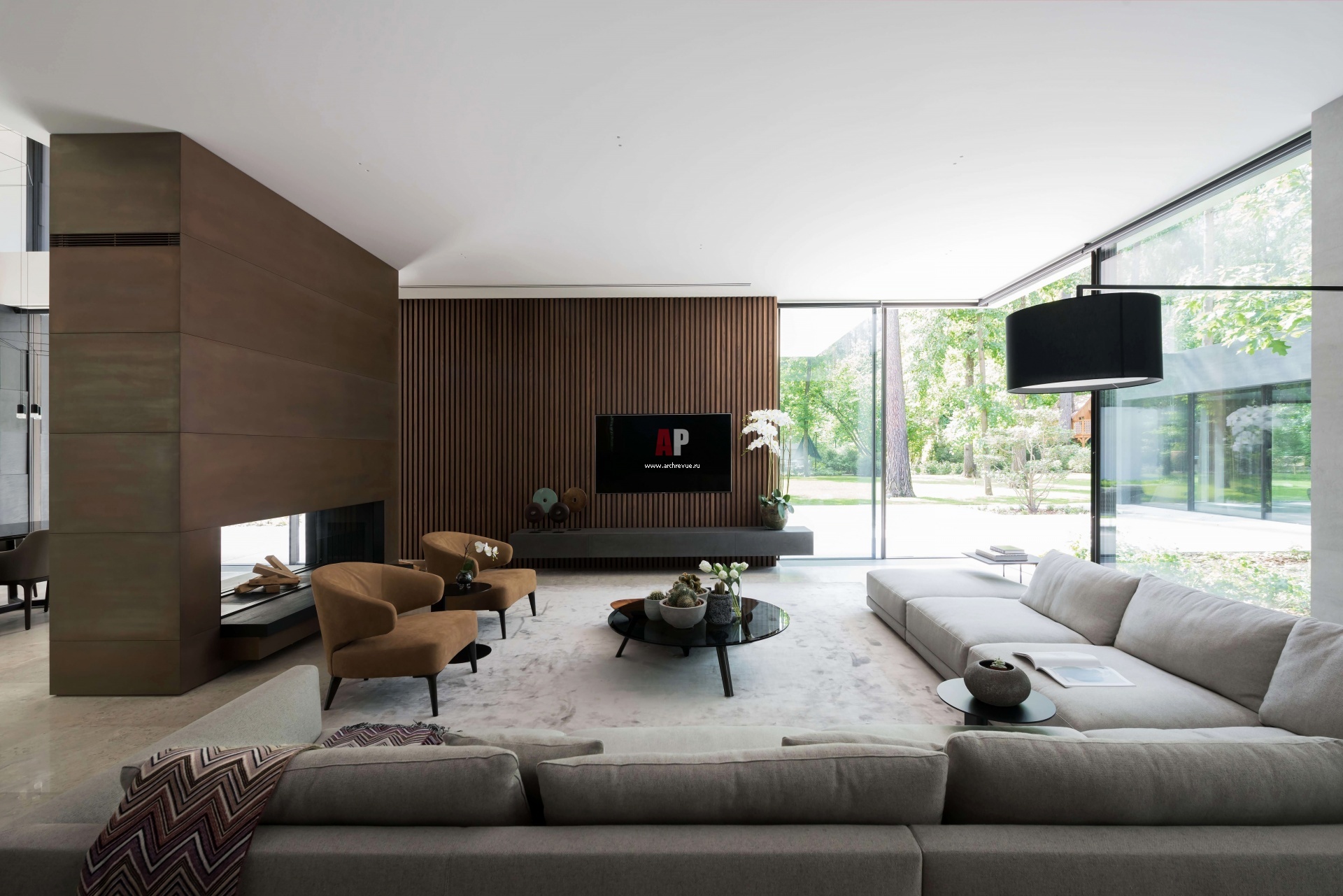 Гостиная с панорамным остеклением и выходом в сад. Зона ТВ оформлена деревянными рейками. Двухсторонний камин облицован медными листами. На полу – широкоформатный керамогранит. Диван, журнальный столик, кресла, Minotti. Торшер, Zeitraum.