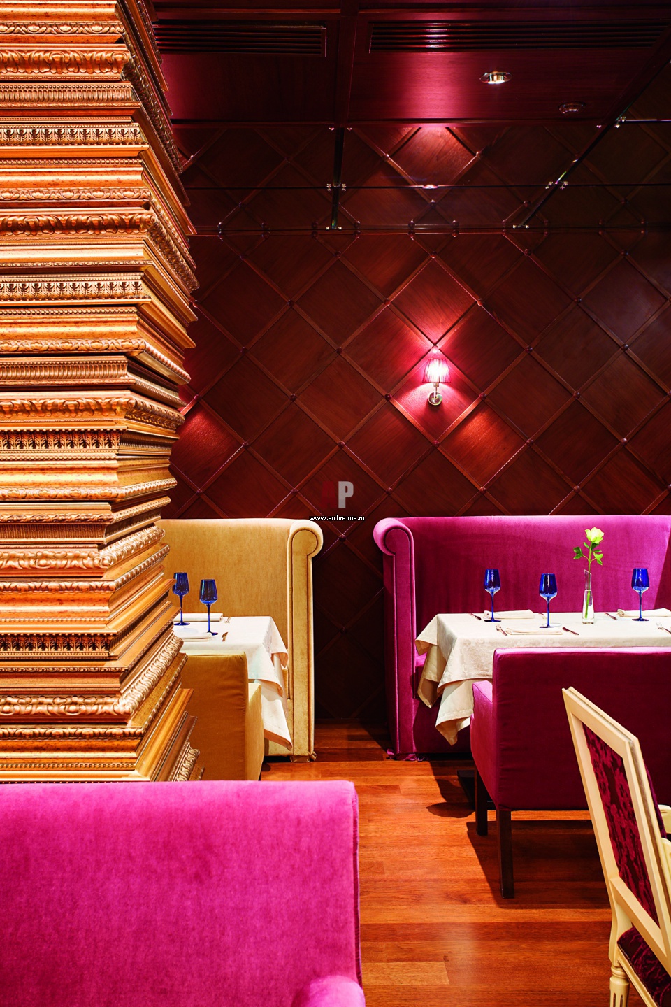 Стены зала оформлены деревянными раскладками, изготовление «Старый Мастер». Потолки частично сделаны зеркальными.