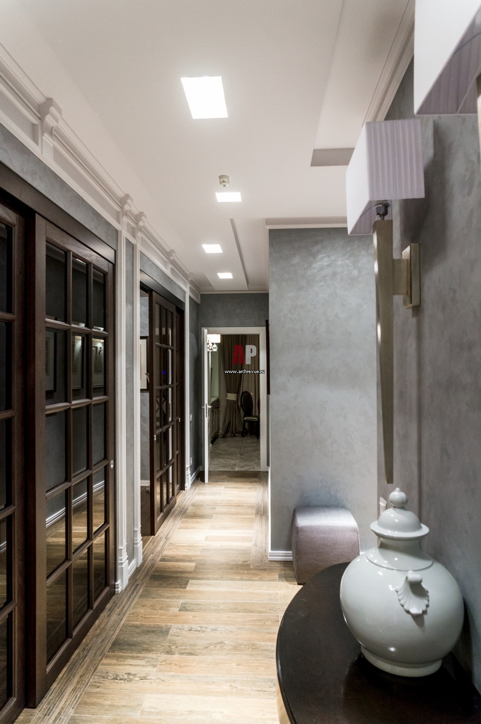 Входная группа квартиры выполнена во фламандском стиле. Стены выкрашены в сложный серый цвет. Частью архитектурного решения стен являются встроенные шкафы с филенчатыми фасадами. В той же стилистике выполнены раздвижные перегородки, изолирующие гостиную.