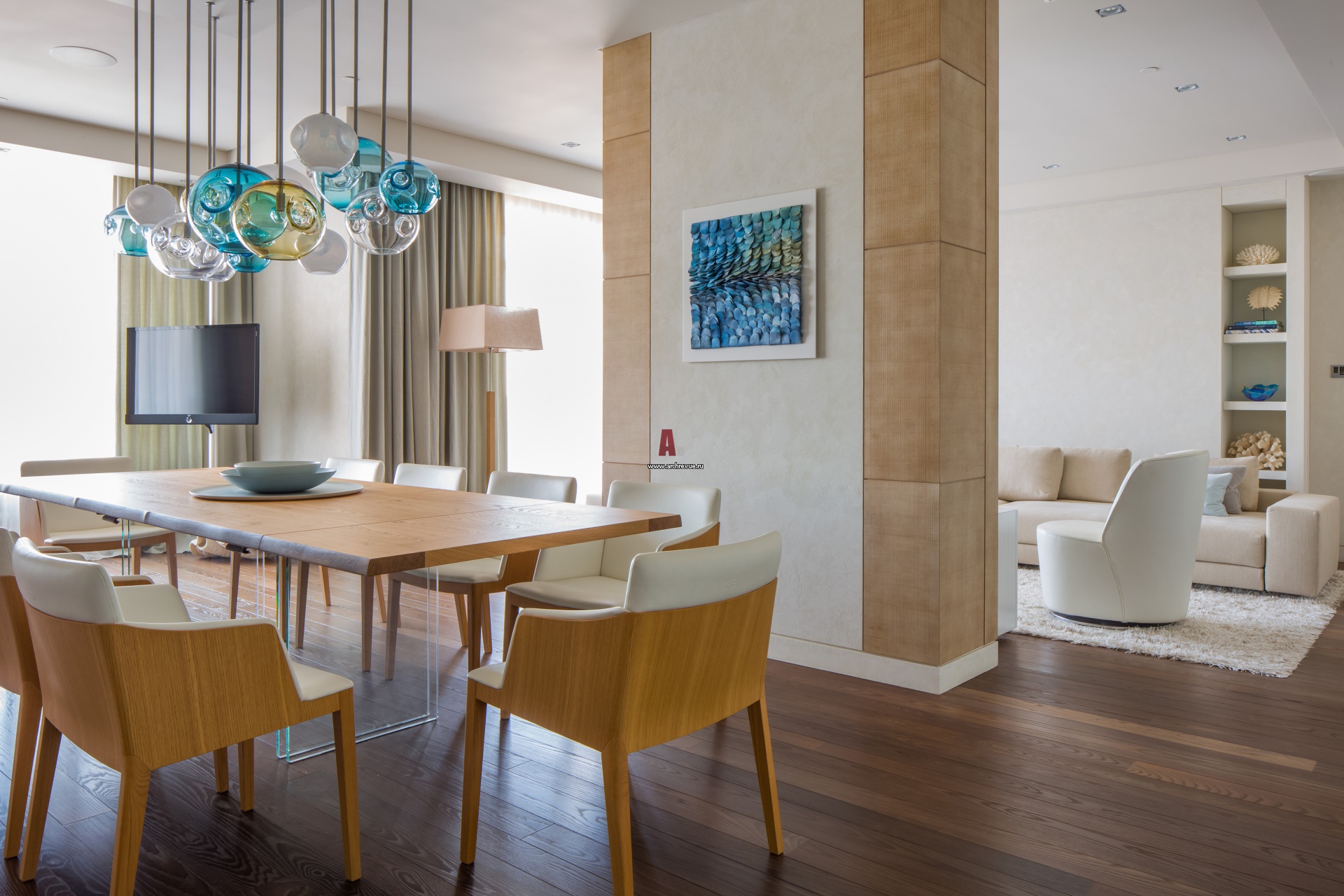 Для створок всех встраиваемых шкафов и поверхностей настенных панелей был выбран единый цвет и фактура шпона. Его текстура напоминает текстуру дерева, которое долгое время находилось под воздействием морской воды, солнца и песка. На стенах – декоративные финиши с фактурой песчаных дюн.